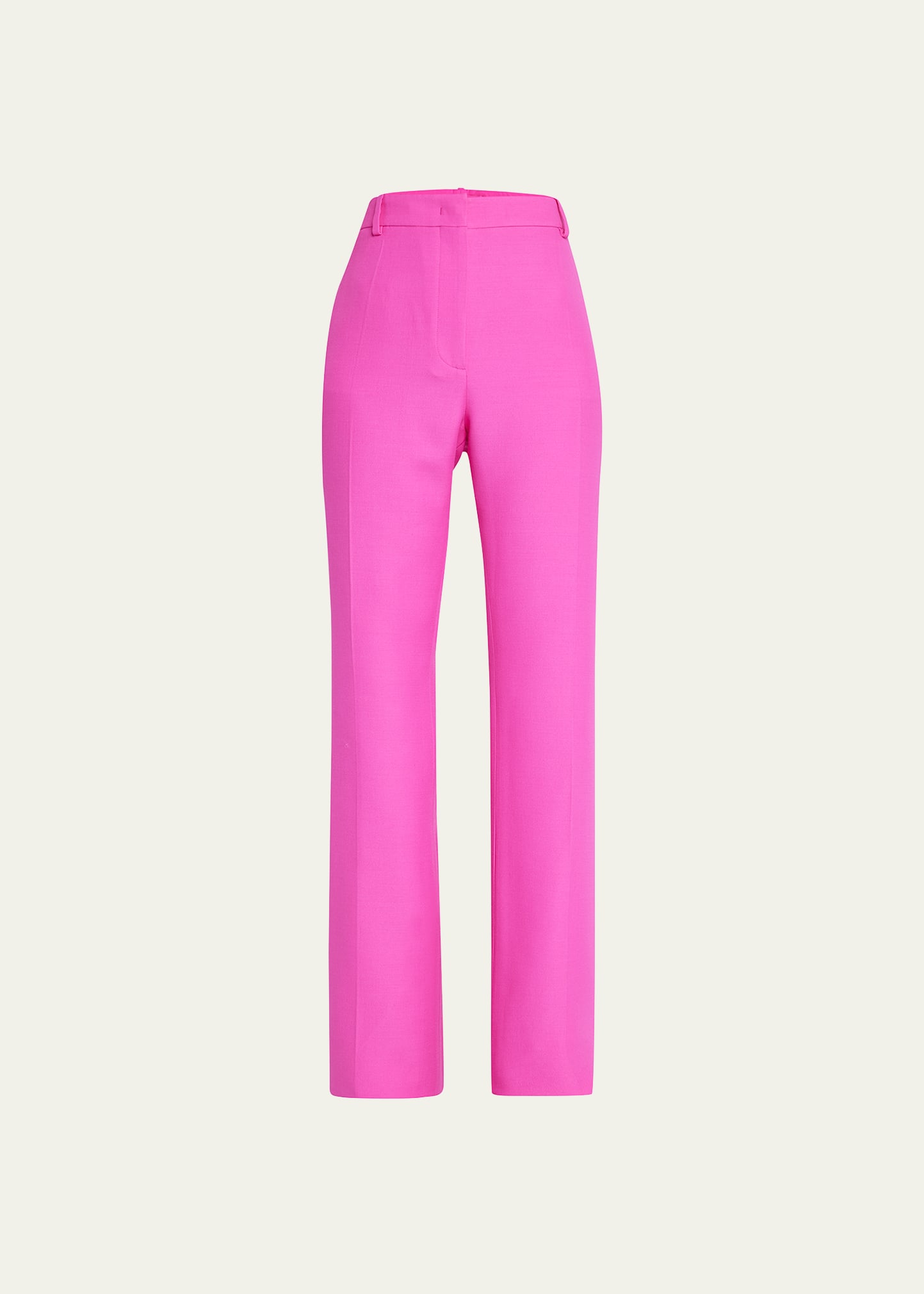 Valentino couture trousers in solid crepe Mid rise sits high on hip Flat front Side lsip pockets; back welt pockets Straight legs Full lneght Hook/zip fly; belt loops Virgin wool/silk Made in Italy