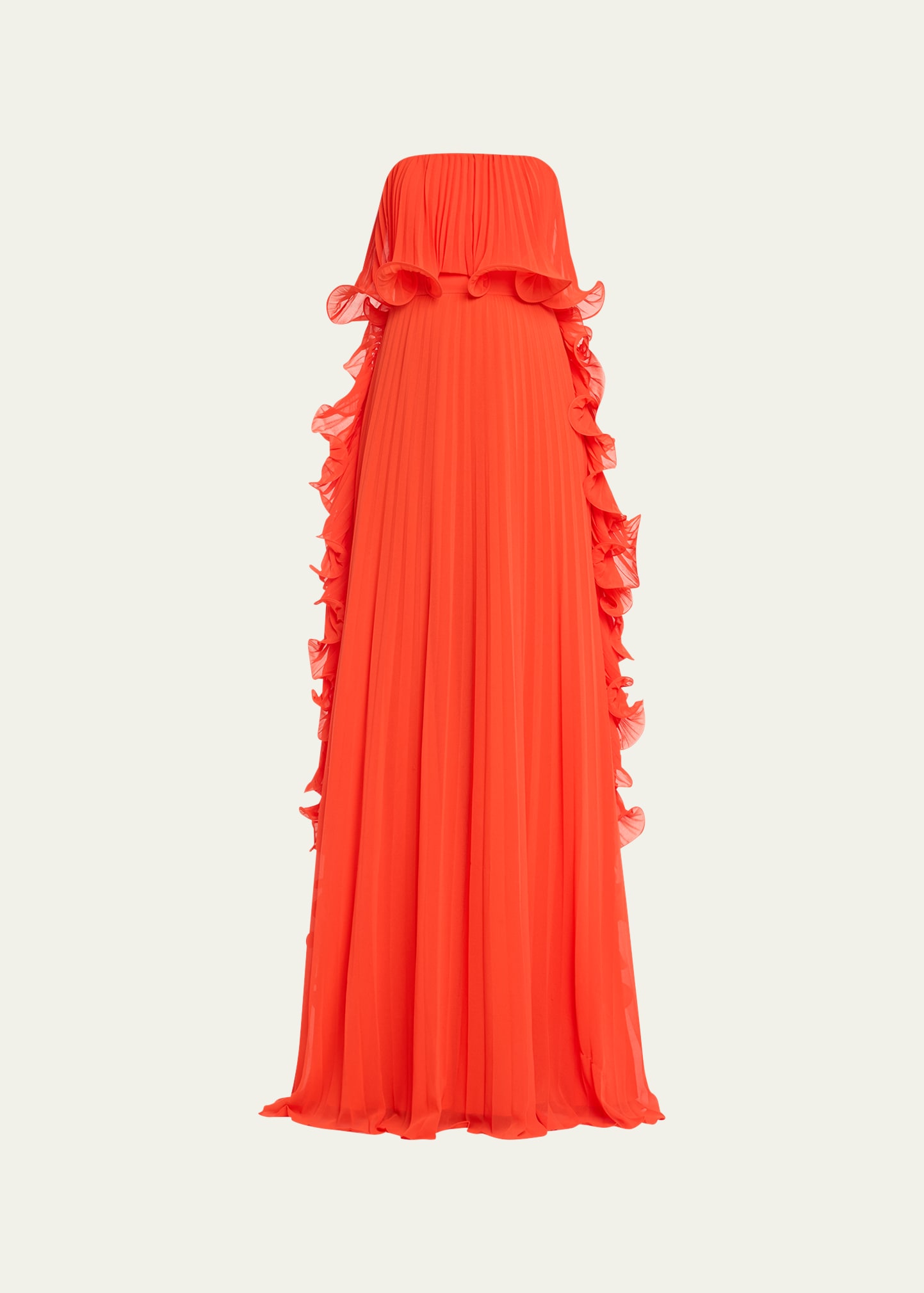 Badgley Mischka's strapless gown is crafted of delicate pleated fabric with ruffled accents. Square neck Strapless Back zip 100% polyester Dry clean Imported SIZE & FIT About 54.25" from shoulder to hem Model measurements: 5'10" tall Model is wearing a US size 4