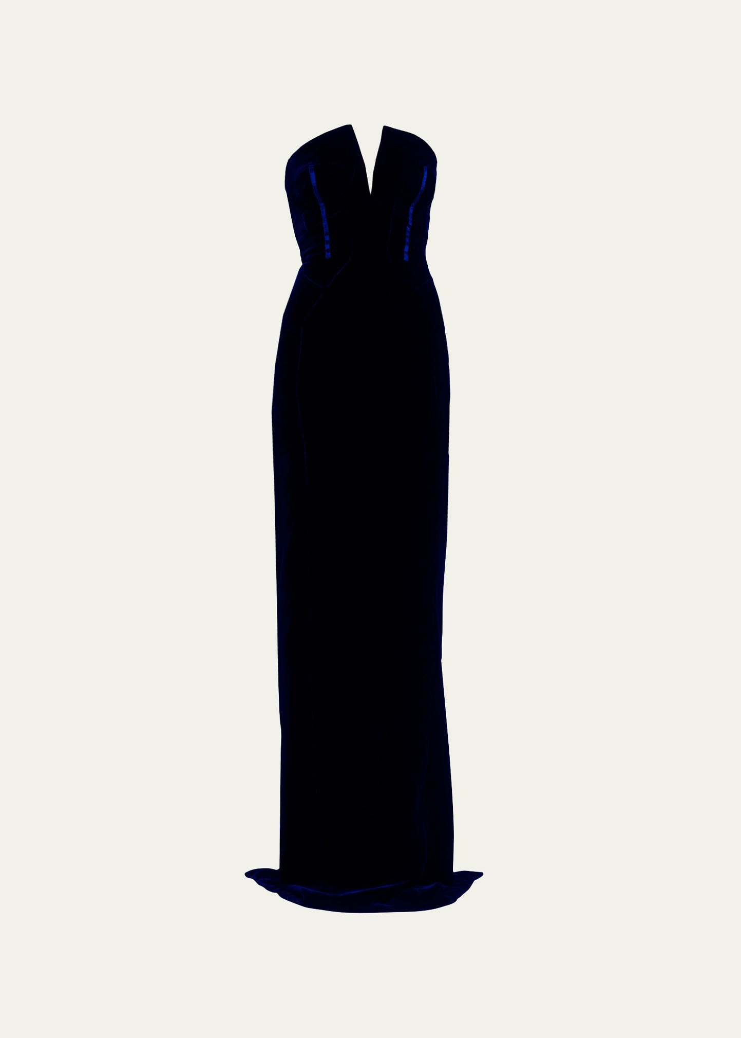 TOM FORD velvet column gown features corset-style construction at the bodice Strapless neckline; v-shape Sleeveless Concealed back zip Back center slit Full length Column silhouette Viscose/cupro Lining: Linen/silk Made in Italy