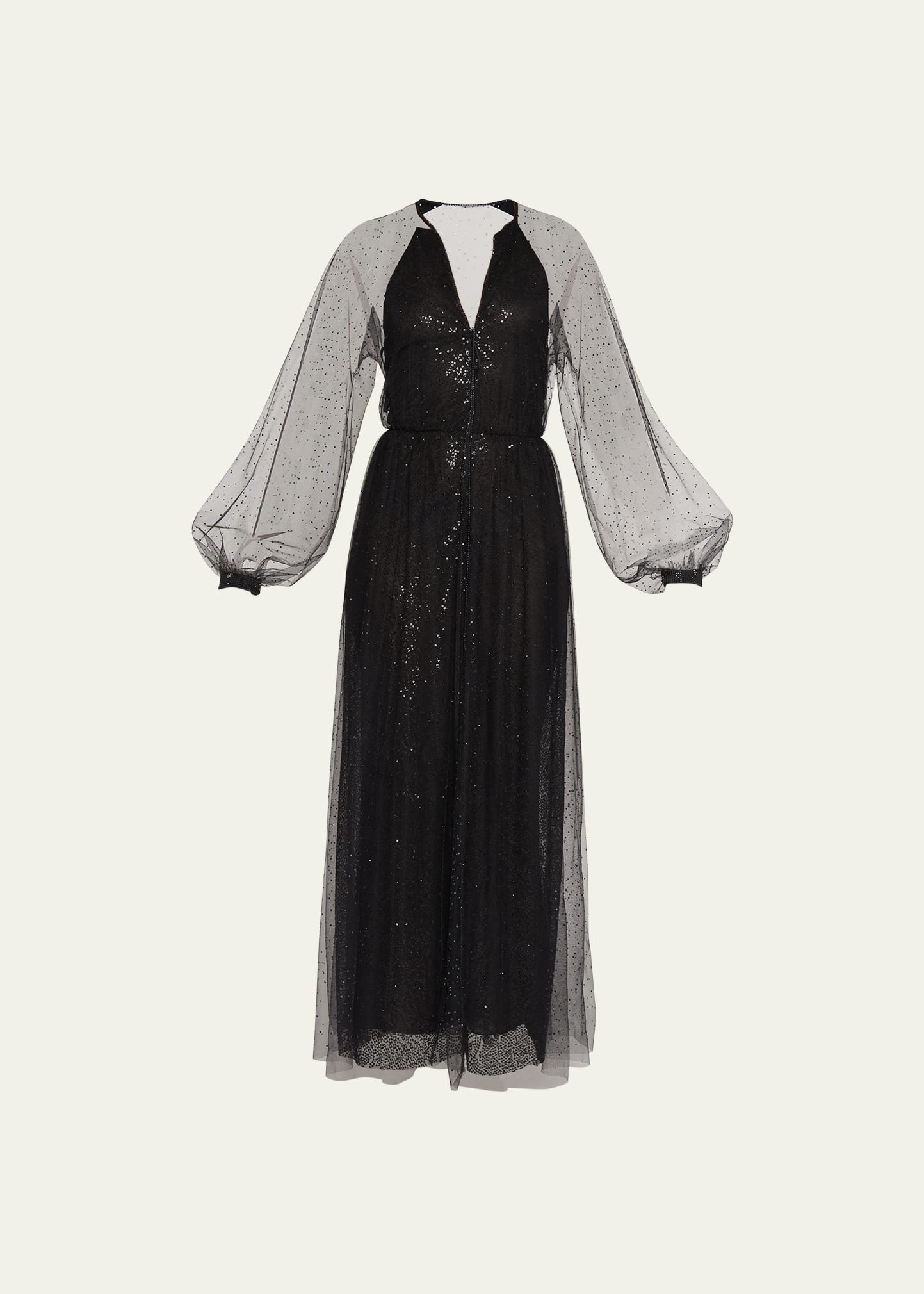Giorgio Armani sequin gown featuring strass embellished tulle overlay V neckline Long blouson sleeves A-line silhouette Full length Invisible zip front Silk Dry clean Made in Italy
