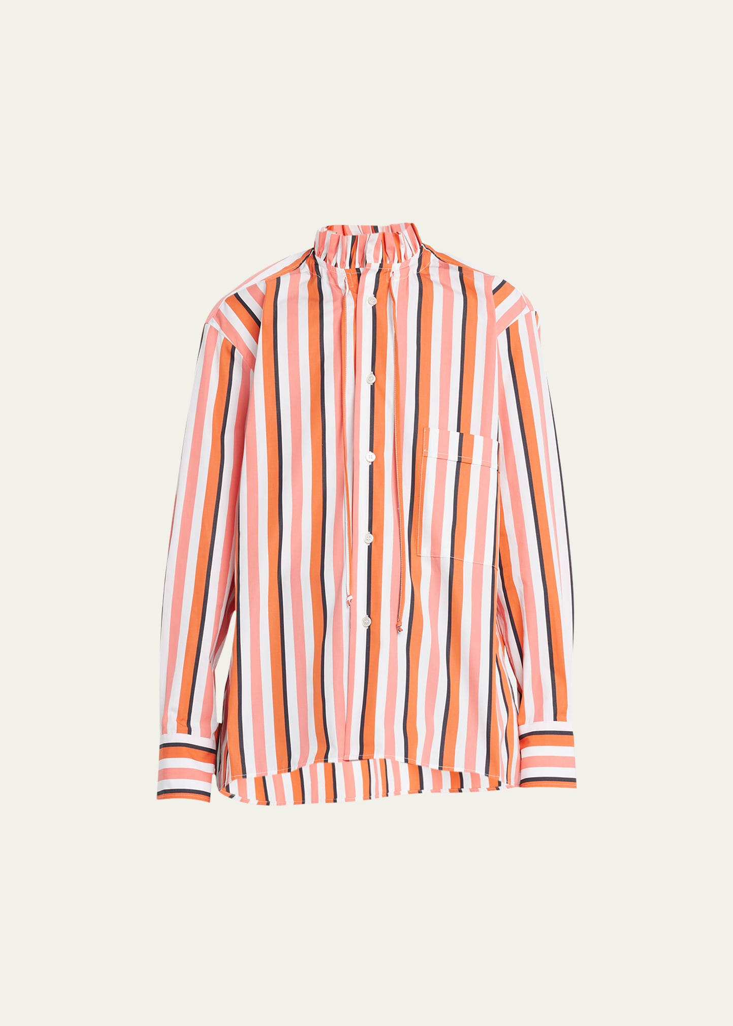 Plan C striped shirt with a ruffled mock neckline Button-front Long sleeves Front patch pocket Shirttail hem Mid-length Relaxed fit Cotton Made in Italy