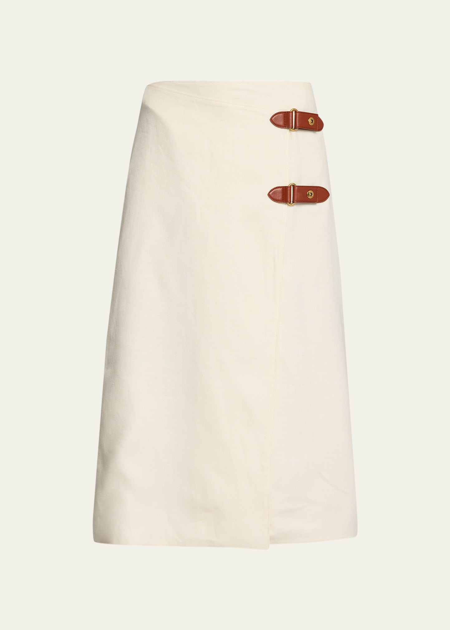 Loro Piana structured linen and wool midi skirt features leather belted details at the hip Mid-rise Front center slit Hem falls below the knee Skirt falls straight from hip to hem Flax/virgin wool Dry clean Trim: Leather Made in Italy