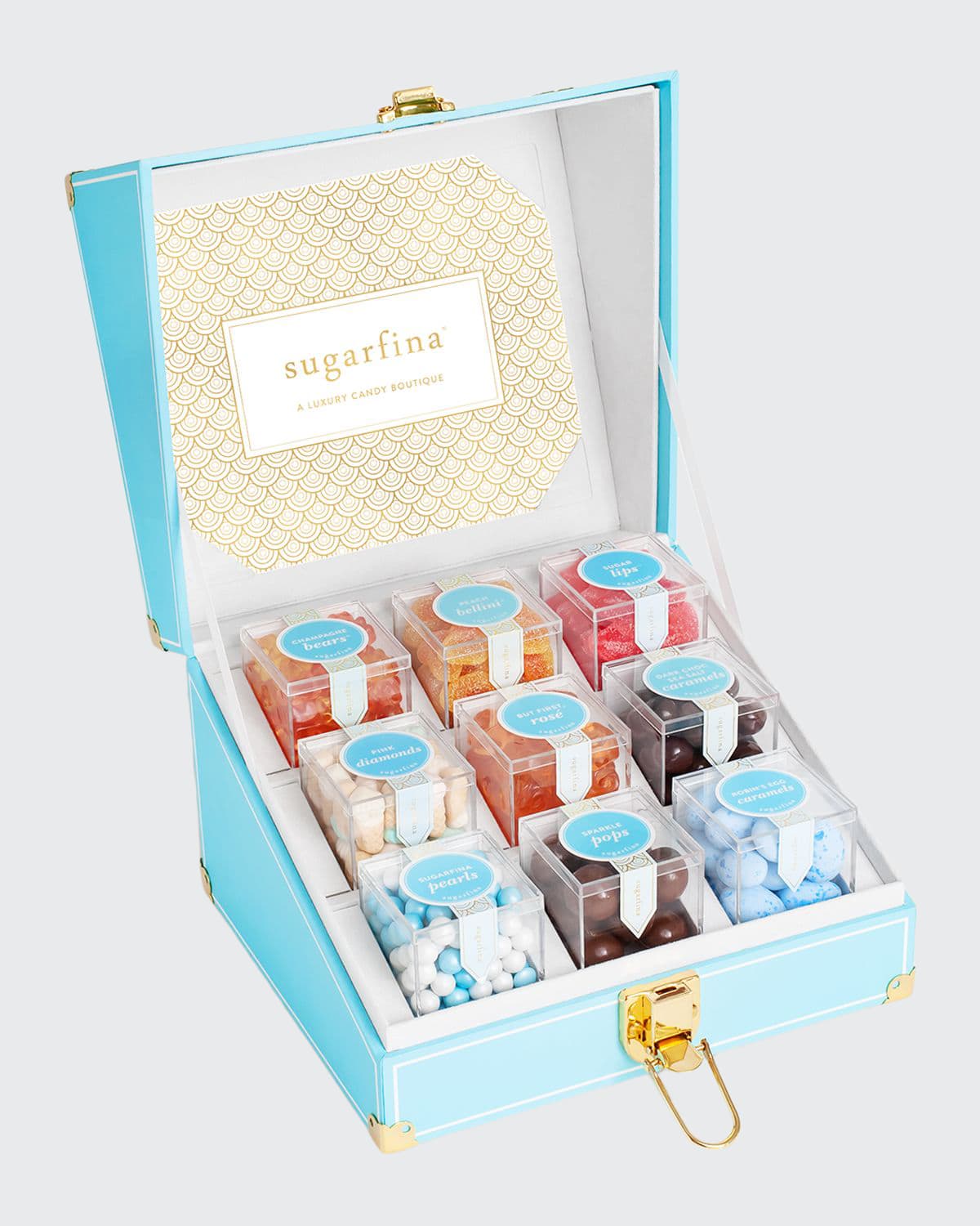 Meet the smaller version of Sugarfina's iconic Candy Trunk. Open the polished brass lock and lift the lid to reveal 9 of Sugarina's favorite Candy Cubes nestled into a tiered display lined with luxe velvet. This beautiful trunk is a signature keepsake. Includes: Robin's Egg Caramels, Ice Cream Cones, Sparkle Pops, Dark Chocolate Sea Salt Caramels, Baby Whales, Rose All Day Bears, Peach Bellini, Champagne Bears, and But First Rose Roses. Box, approx. 9.375"W x 6.5"D x 8.25"T. Total net wt: 30.
