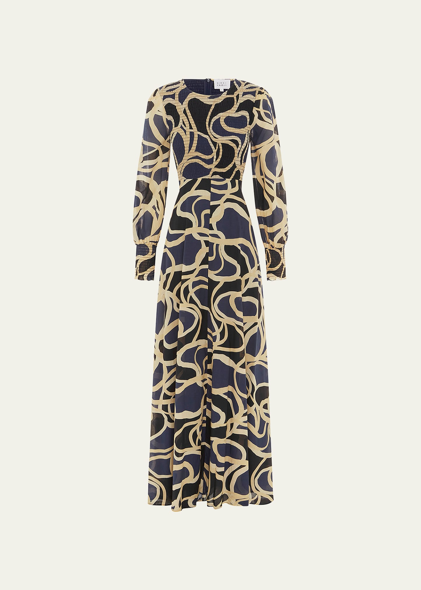 BIRD & KNOLL "Sunset" printed dress features a smocked bodice Round neckline Long bishop sleeves; smocked cuffs Full length Slipover style Cotton Machine wash cold Imported