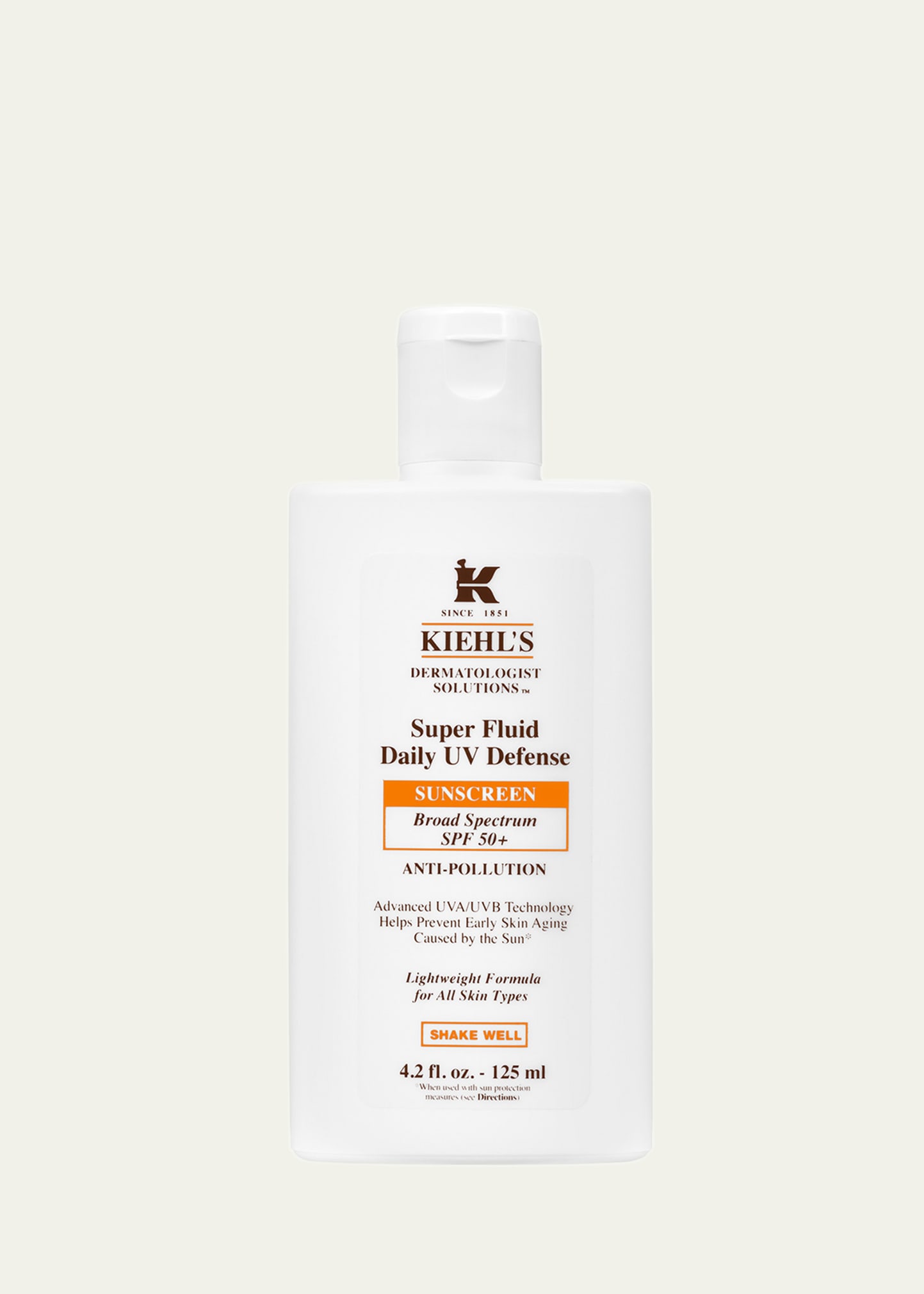 Kiehl's Since 1851 Super Fluid Daily UV Defense SPF 50+ Sunscreen, 4.2 oz. What It Is: Kiehl's everyday facial sunscreen with advanced UVA/UVB technology and pollution protection helps defend against UV rays, pollution, and free radicals. Help protect skin from the early signs of aging with Kiehl's lightweight facial sunscreen with SPF 50+. Kiehl's daily, non-comedogenic sunscreen with Vitamin E, Baicalin, and powerful antioxidants absorbs quickly into the skin a.