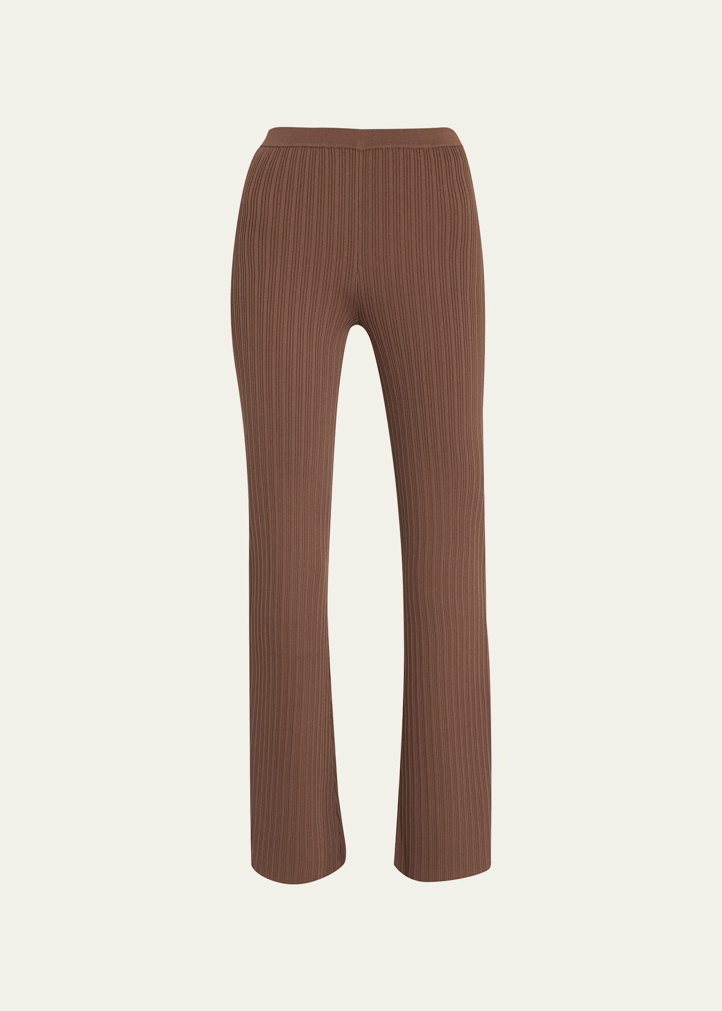 SIR "Sylvie" ribbed knit pants with side slits Elastic waistband High rise Fitted through hip; flared from knee Full length Pull-on style Viscose/nylon Dry clean Imported