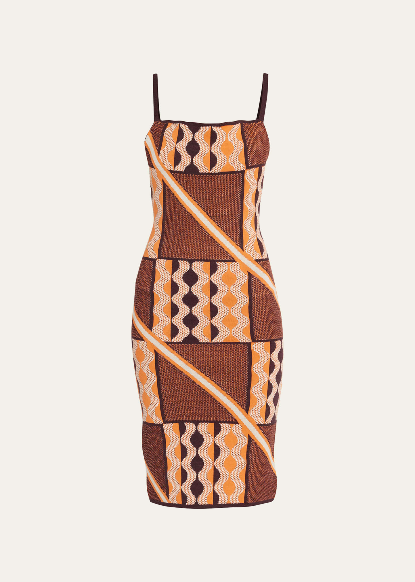 Ahluwalia "Tafii" abstract-printed midi dress Scoop neckline Spaghetti straps; sleeveless Bodycon fit Hem falls below the knee Slipover style Wool Hand wash Imported