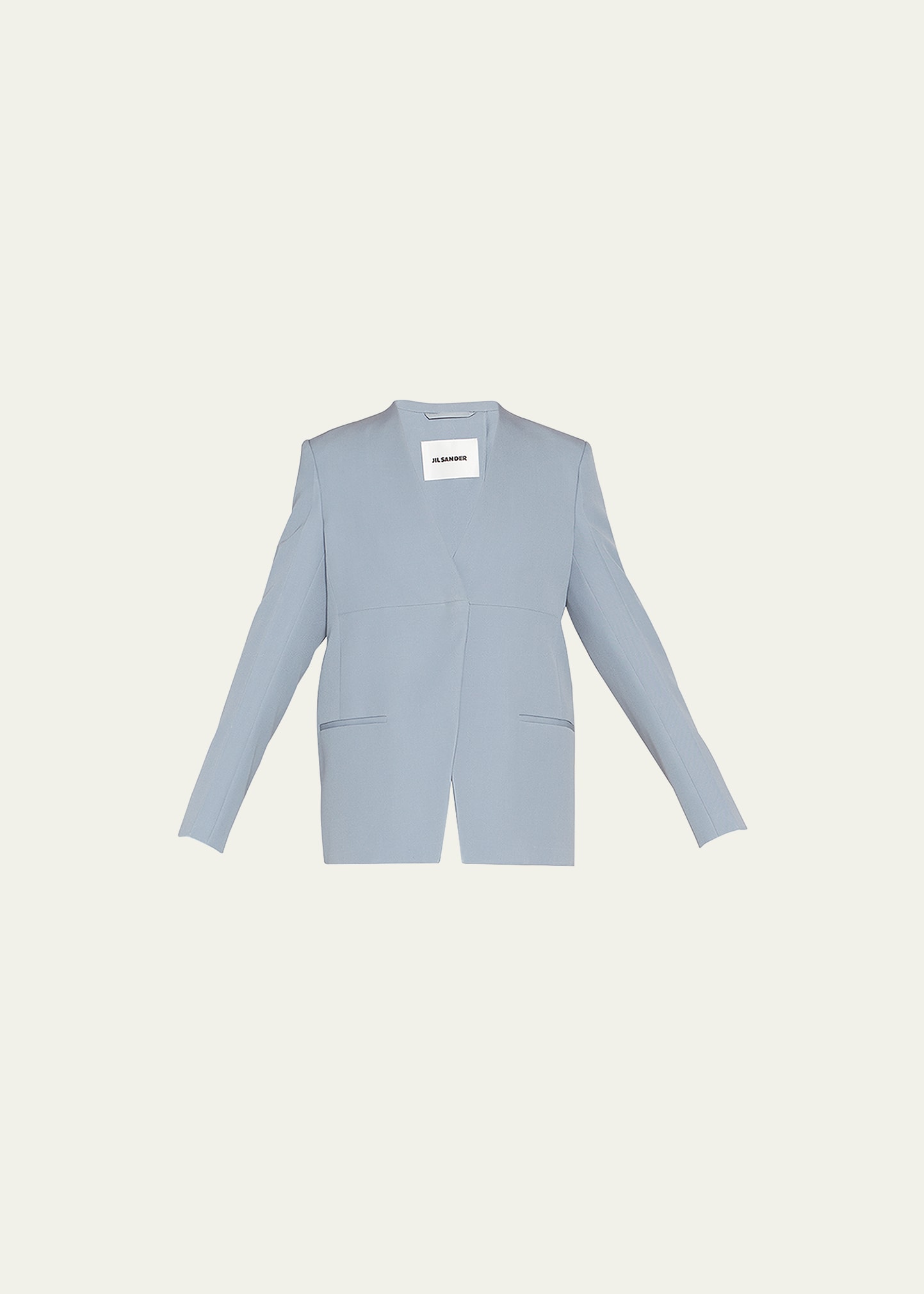 Jil Sander solid jacket with back strap Collarless; button front Long sleeves Hip welt pockets Tailor-made fit Vented back Wool Made in Italy