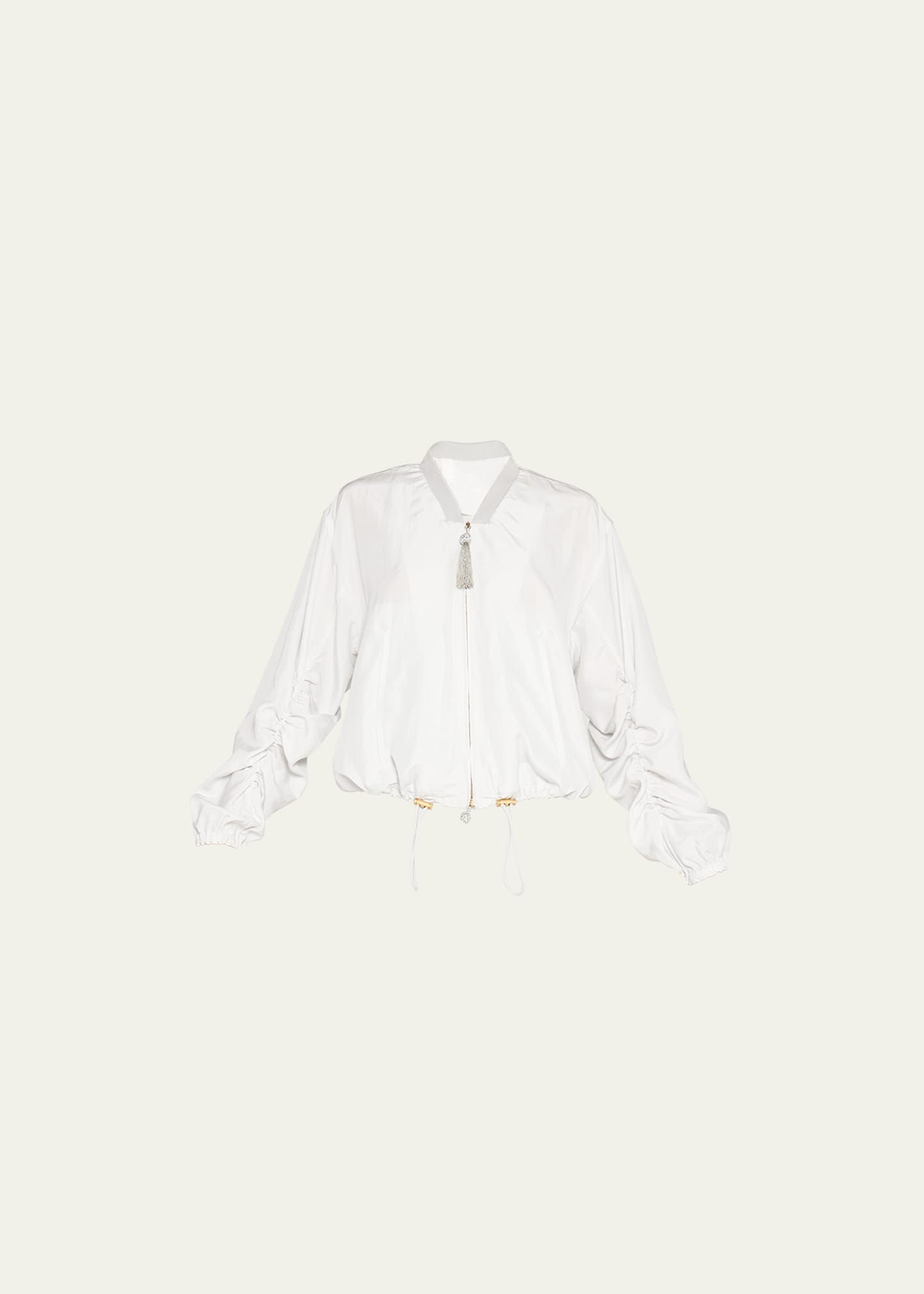 Giorgio Armani bomber jacket featuring a tassel zipper detail and ruched sleeves Baseball collar; two-way zip front Long sleeves; elasticized cuffs Side welt pockets Loose fit Drawcord cinched hem Silk Dry clean Made in Italy