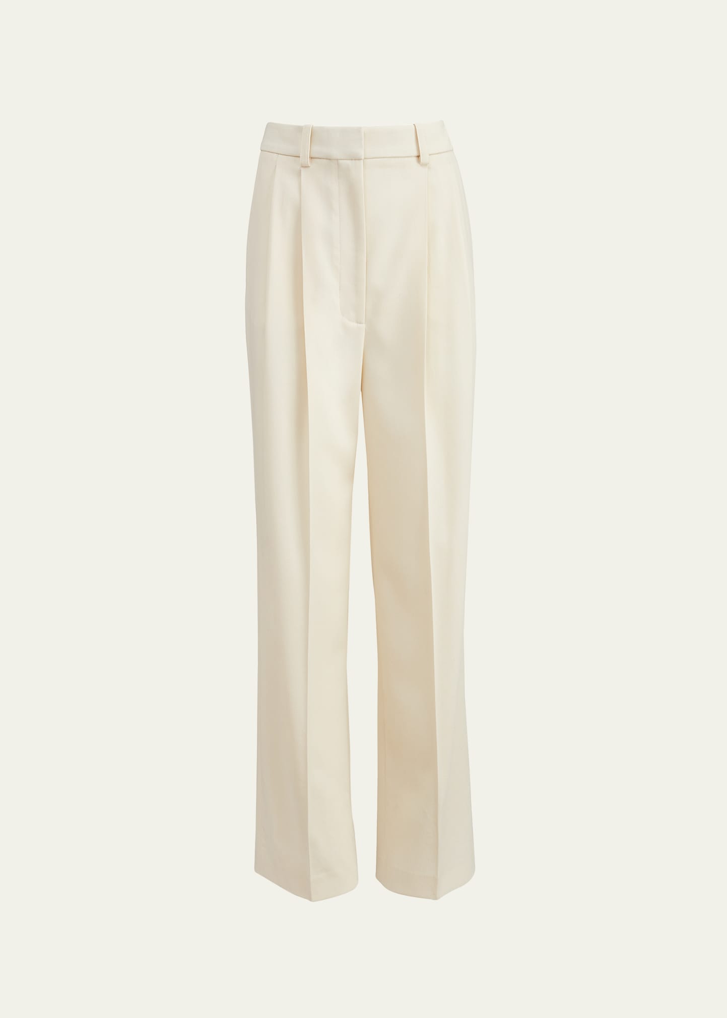 Khaite "Teyana" pants with pleated front detail High rise Side slip pockets; back welt pocket Wide legs Full length Tab/zip fly; belt loops Viscose/virgin wool/elastane Made in Portugal