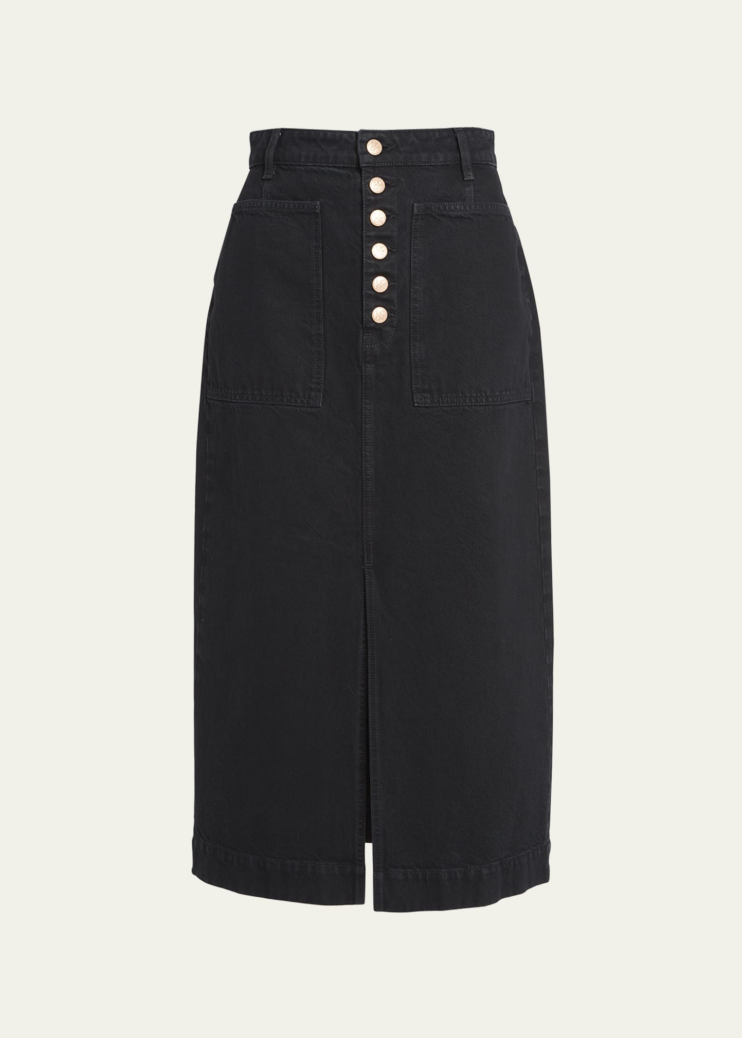 Ulla Johnson "Bea" denim skirt with embossed buttons and leather logo patch High rise Side patch pockets; back patch pockets A-line silhouette Hem falls below the knee Button fly; belt loops Cotton Machine wash cold Made in USA