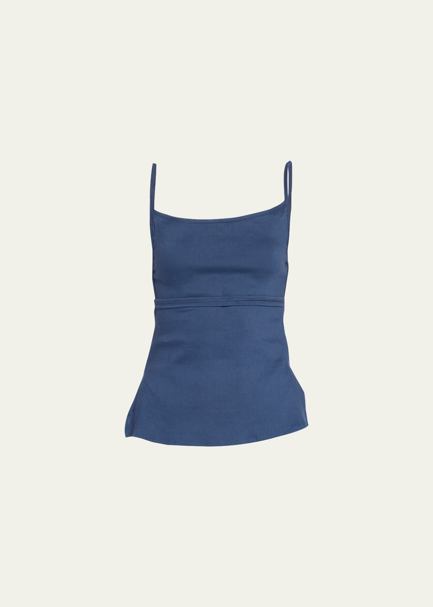 ANEMOS "The K.M." tank top crafted from a stretch cupro fabric Square neckline Adjustable wrap-around self-ties Mini side slits Slim fit Slight peplum effect hem Linen/viscose/elastane Made in USA from imported materials