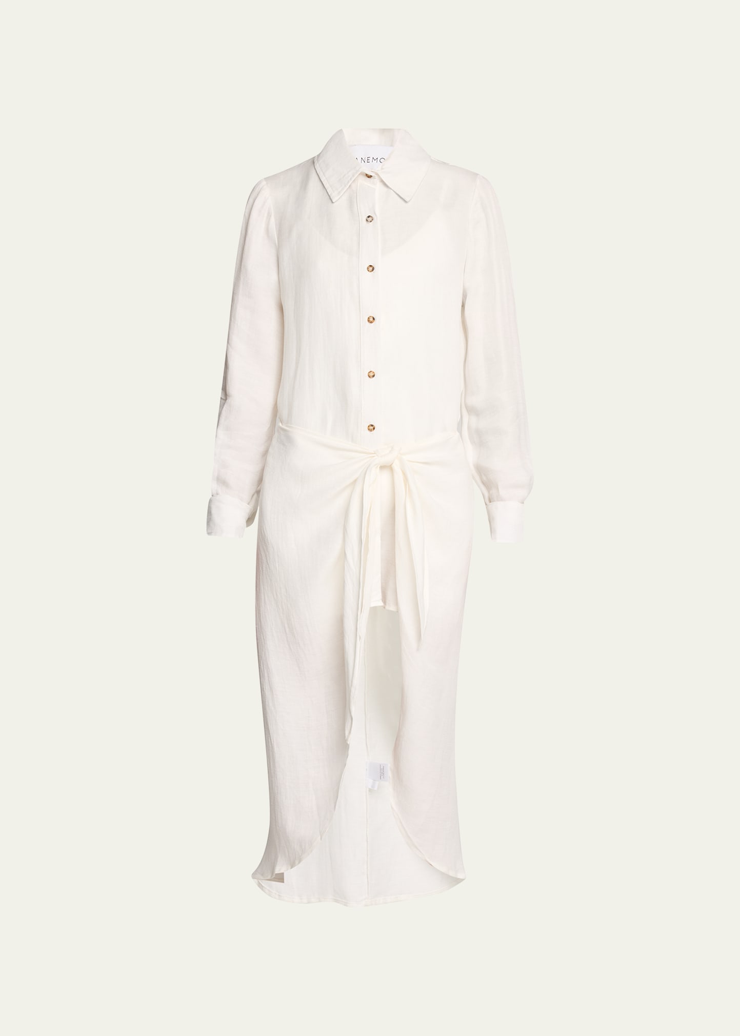 ANEMOS "The LA" shirtdress features a self-tie wrap skirt Spread collar Button front Long sleeves Button cuffs Yoked back Asymmetric hem Linen/cupro Made in USA