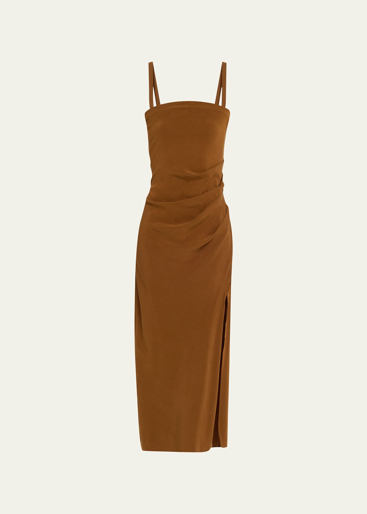 ANEMOS "The Nadege" linen-blend dress features asymmetric draped layers Square neckline Fixed shoulder straps Thigh-high side slit Body-skimming fit Hem falls below the knee Center back zip Linen/viscose/elastane Made in USA