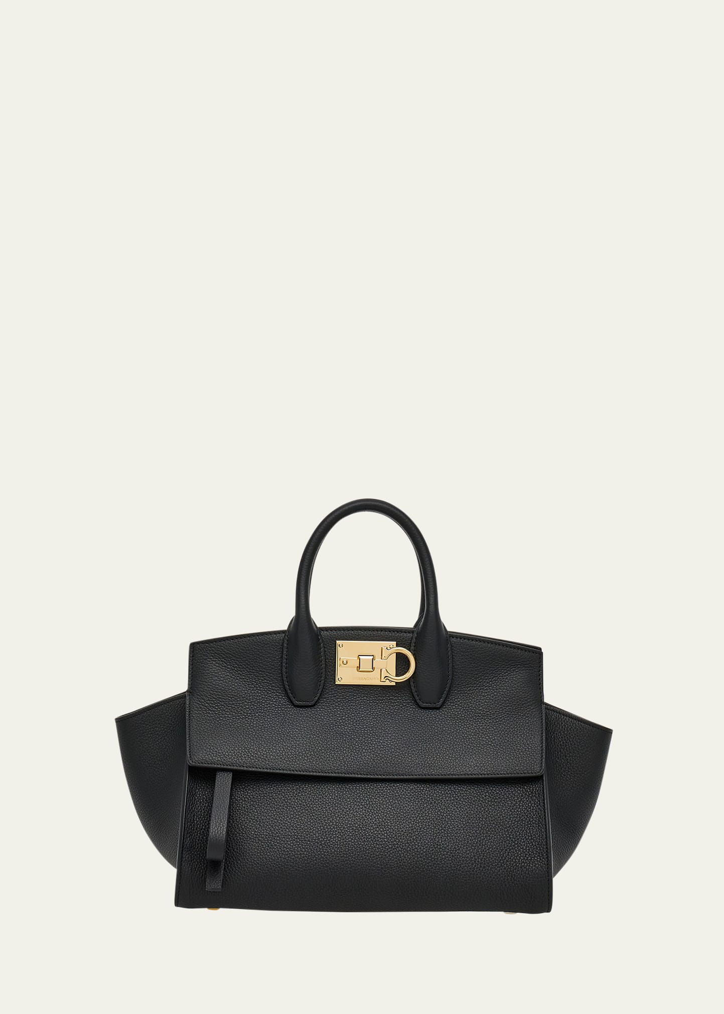 Ferragamo "The Studio" top handle bag in soft calf leather and cotton Rolled top handles Detachable, adjustable shoulder strap Can be worn as a top handle or shoulder bag Open top with Gancini slider clasp closure Exterior, front flap with zip pocket Interior, removable zip pouch bag Feet protect bottom of bag Approx. 9.8"H x 11.4"W x 5.5"D Made in Italy