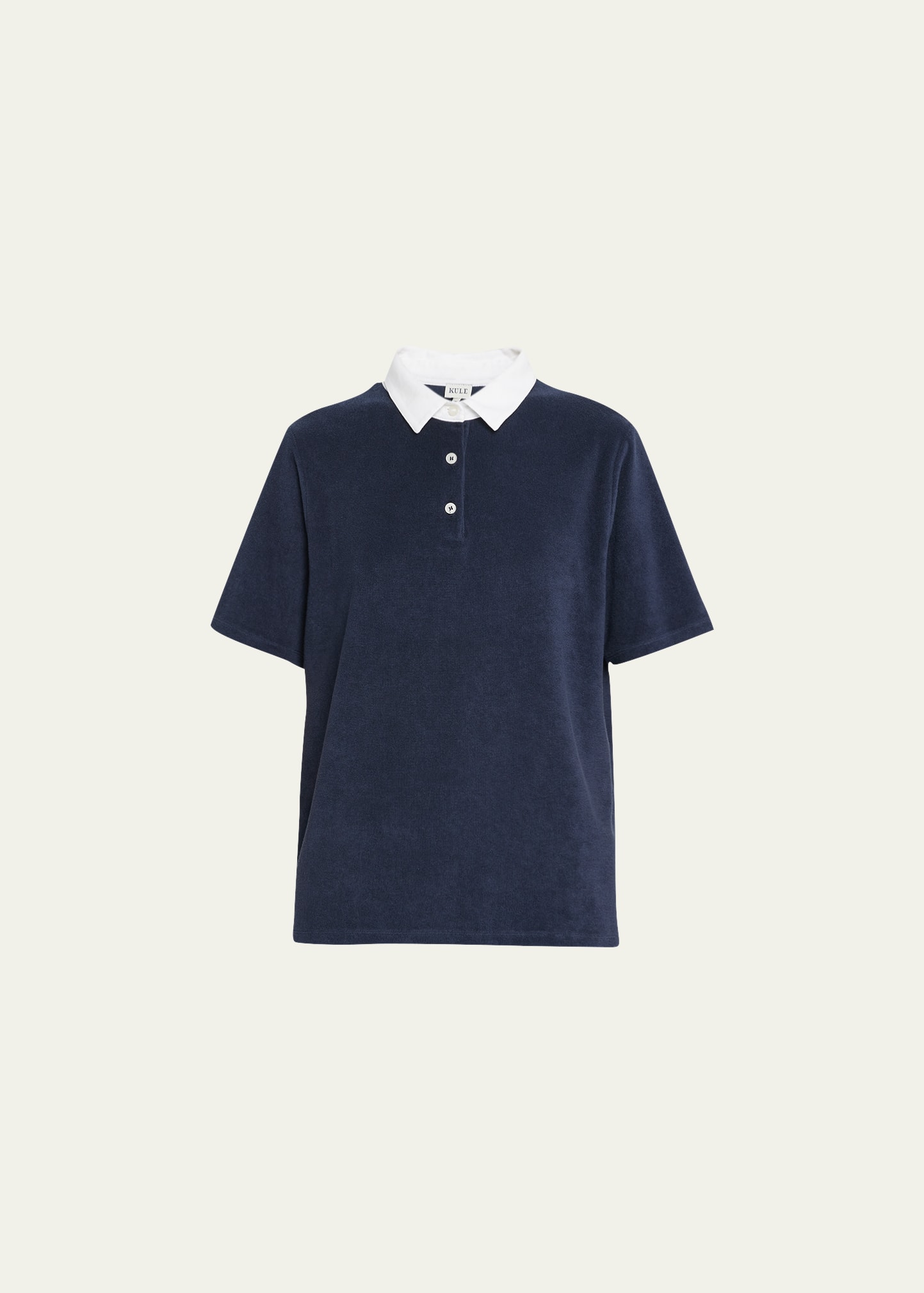Kule sporty chic terry polo top with signature brand taping on the hem Contrast rugby collar; two-button front Short sleeves Relaxed fit Pullover style Cotton/polyester Machine wash Made in Portugal