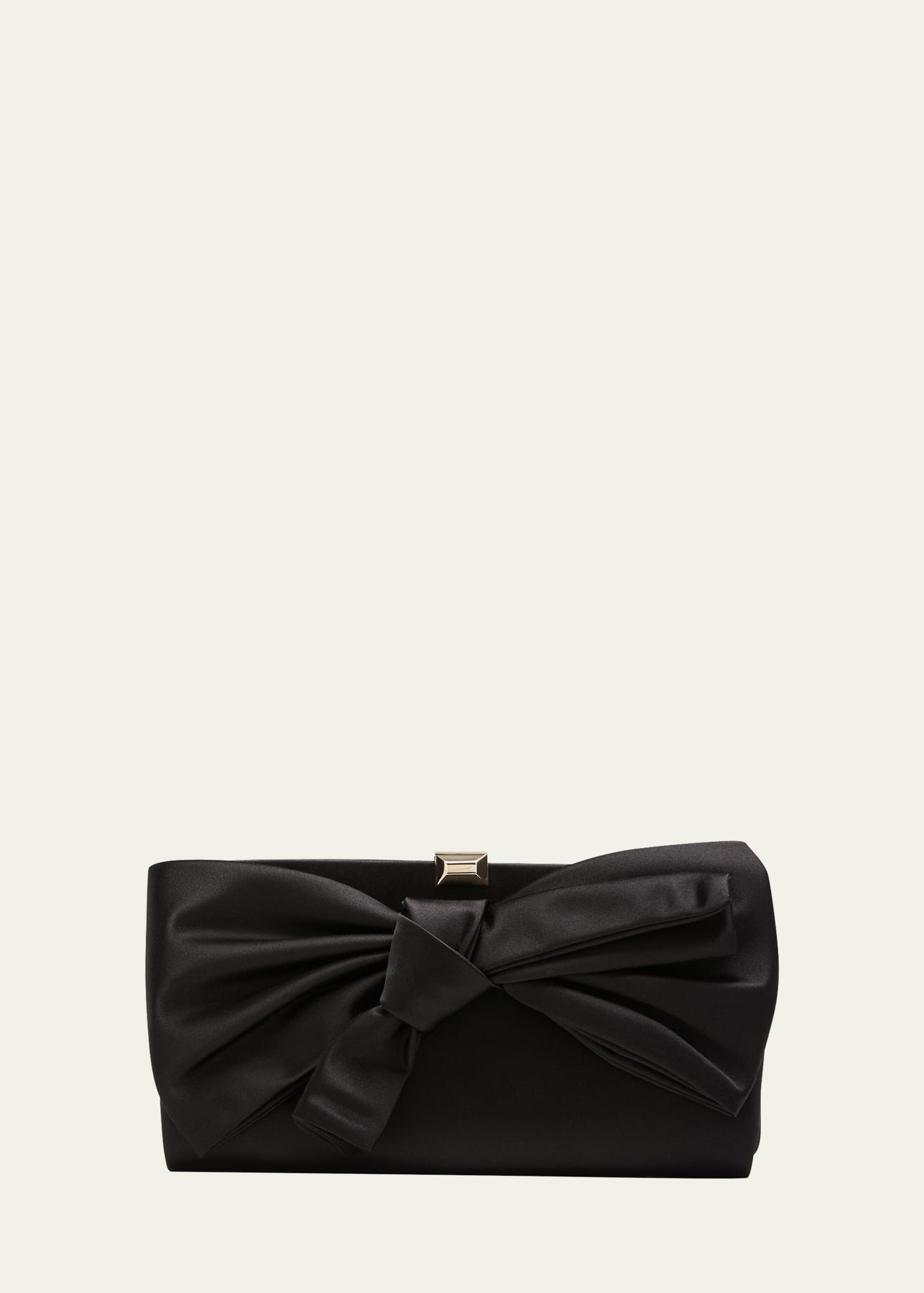 Stuart Weitzman "The VIP" satin clutch bag with loveknot accent Detachable chain shoulder strap, 9" drop/ 19.7"L Can be worn as a clutch or shoulder bag Framed top with lift-clasp closure Lining: Viscose/silk Approx. 5.1"H x 9.6"W x 1.5"D Made in Italy