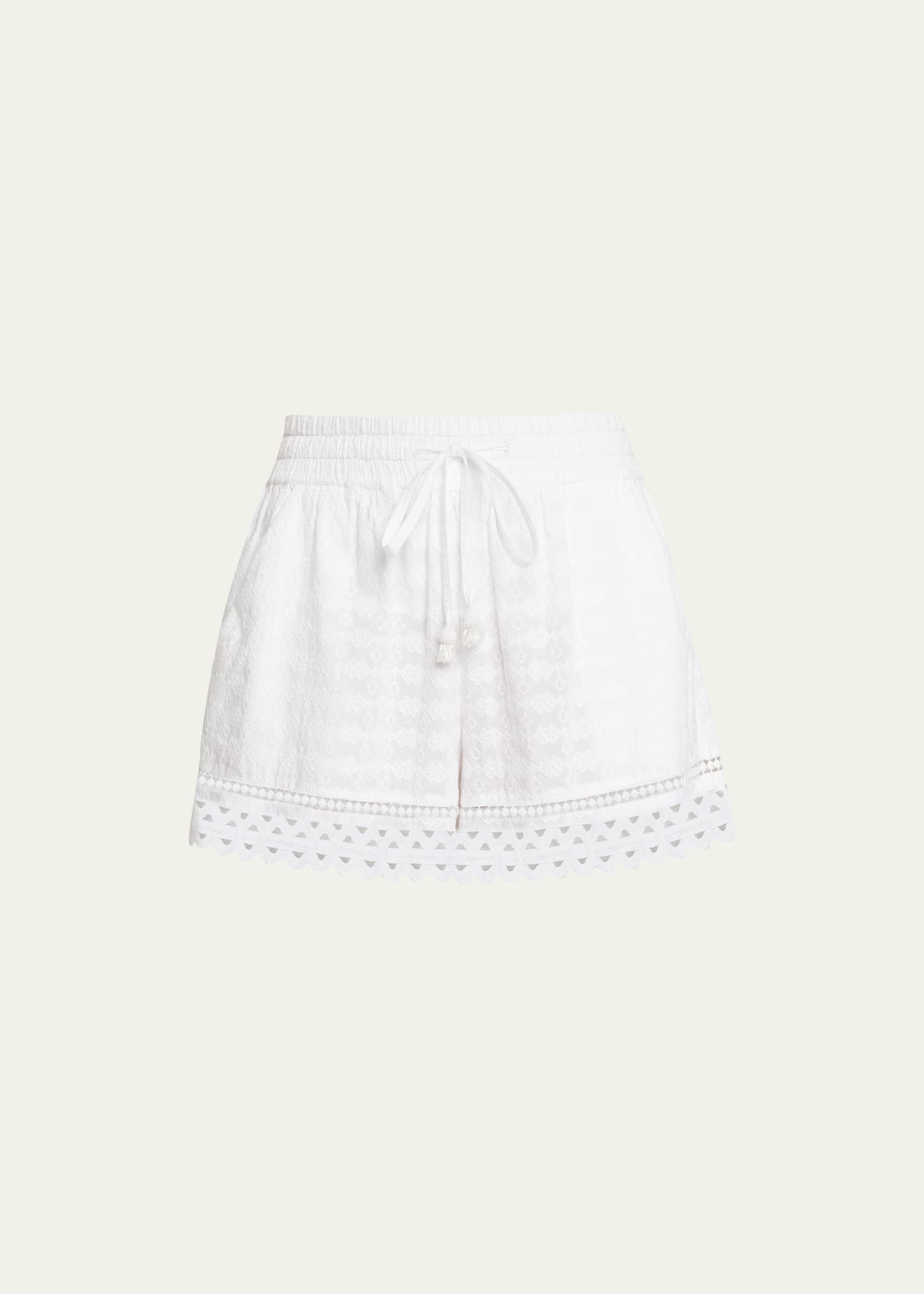 Veronica Beard "Tijana" shorts crafted from a lightweight fabric with intricate eyelet lace and scalloped edges High rise Drawstring waistband Slanted side pockets Relaxed legs Pull-on style Cotton Imported