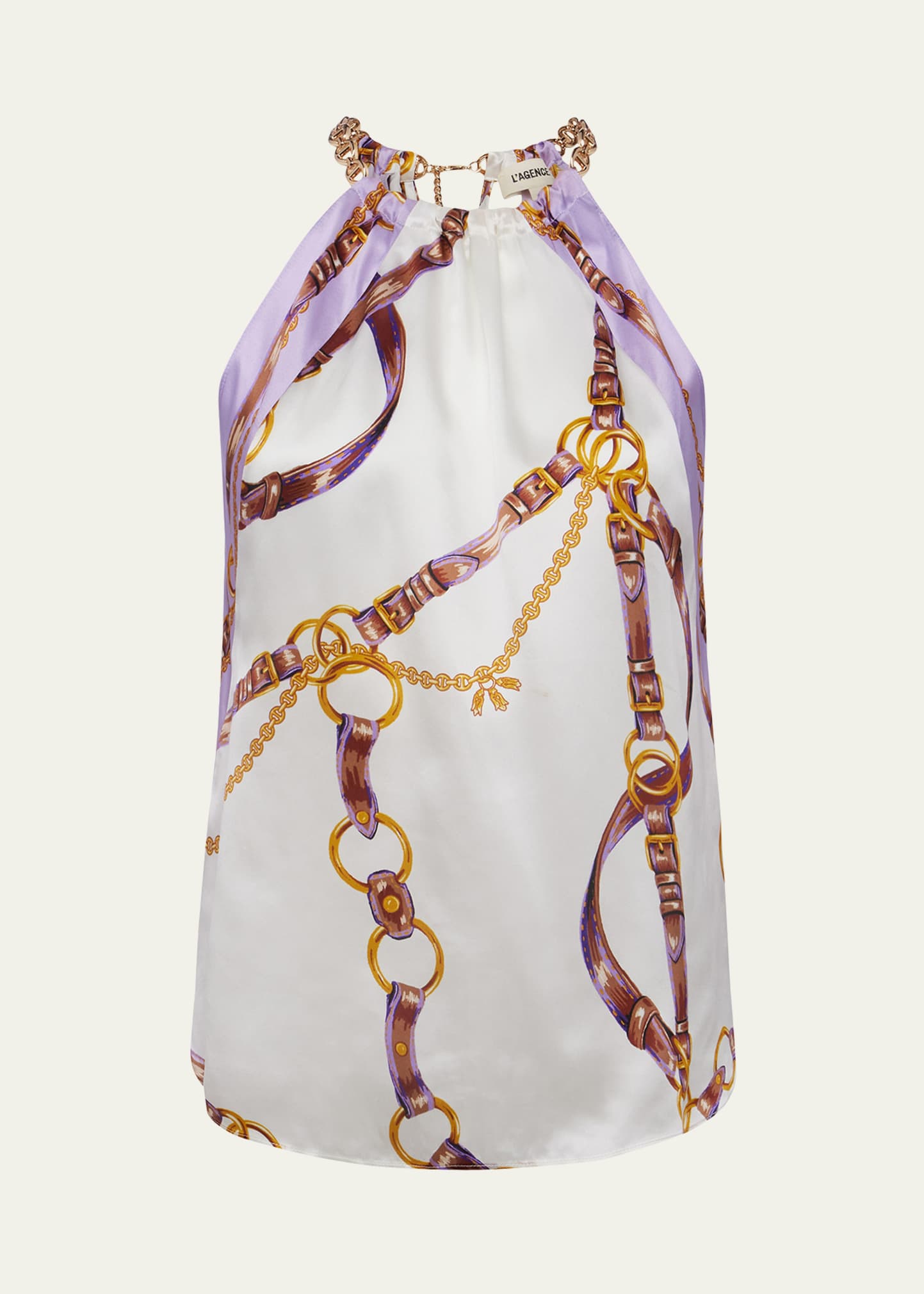 L'Agence "Tillie" lustrous silk scarf top printed with chain detailing Approx. 21.5"L from shoulder to hem Halter neckline; clasps behind the neck Sleeveless Easy fit Slipover style Silk Dry clean Imported