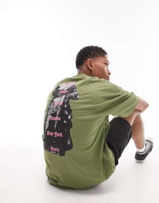Topman extreme oversized fit t-shirt with front and back cities print in khaki-Green