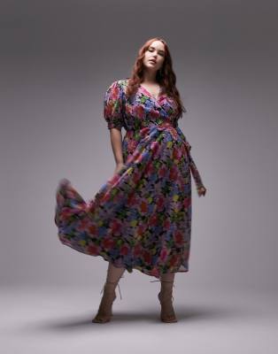 Topshop Curve printed midi wrap dress in blurred floral print-Multi