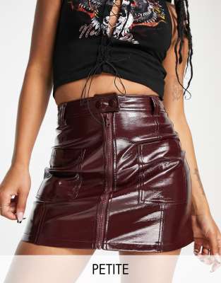 Topshop petite patent zip front pocket mini skirt in burgundy-Red