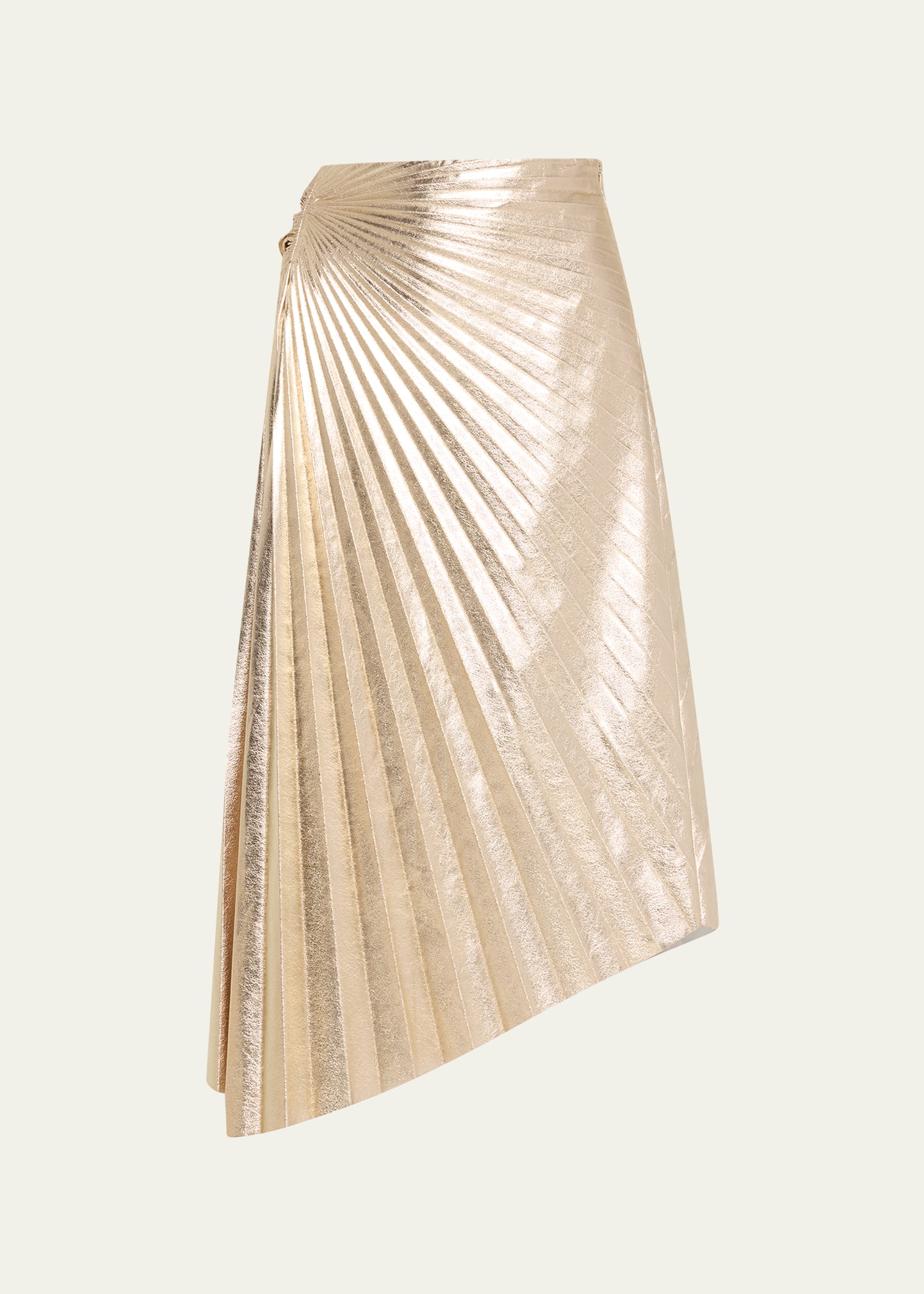 A.L.C. "Tori" midi skirt featuring a gathered waist detail and asymmetric hem in a pleated, metallic vegan leather Left side seam 28.5"; right side seam 36.25". Mid-rise A-line silhouette Hem falls below the knee Side zipper Polyurethane/polyester Spot clean Imported