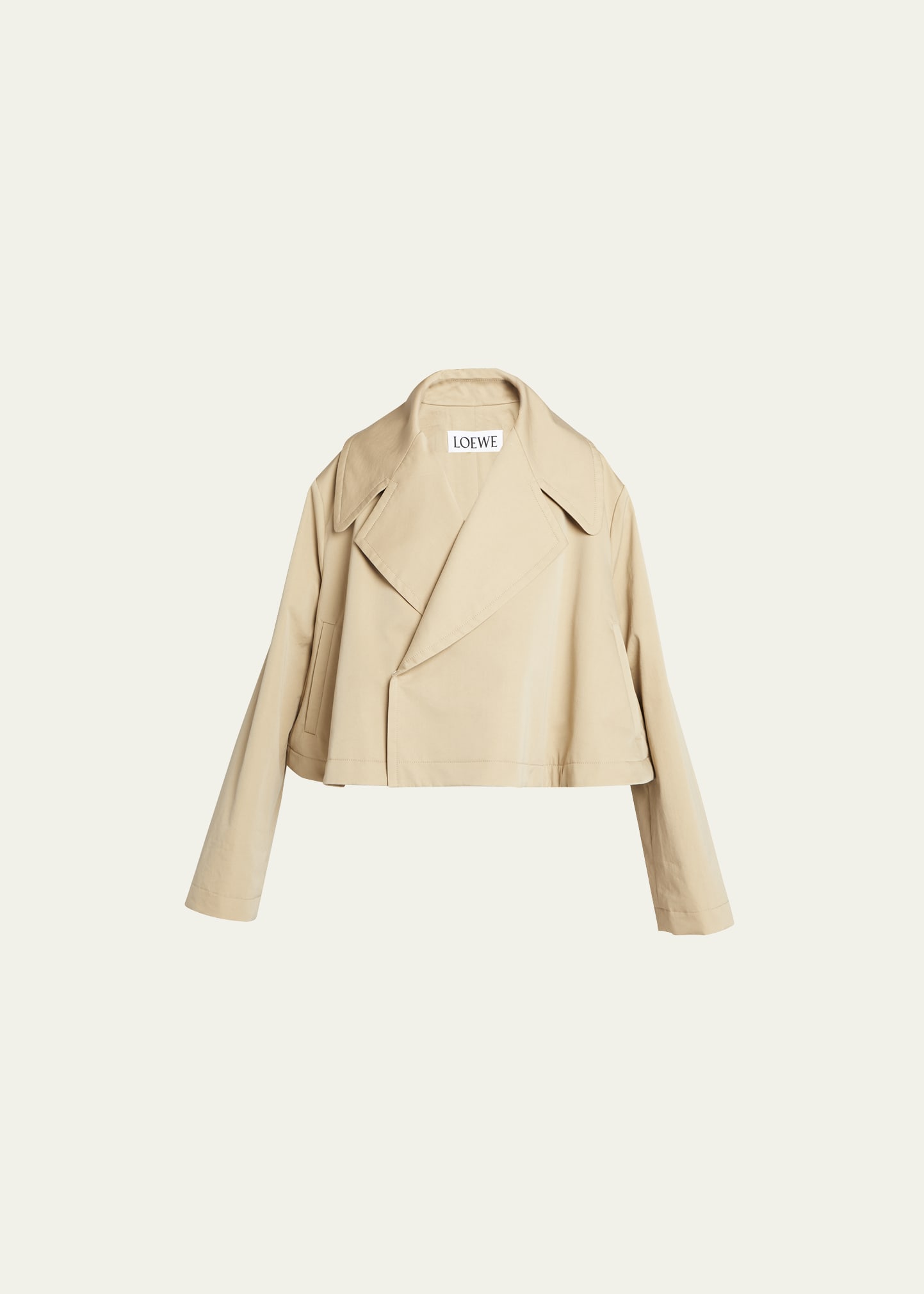 Loewe trapeze trench jacket featuring anagram embossed leather back patch Trench collar; double-breasted front Long sleeves Side welt pockets A-line silhouette Hem hits at the hip Cotton/silk/leather Made in Italy