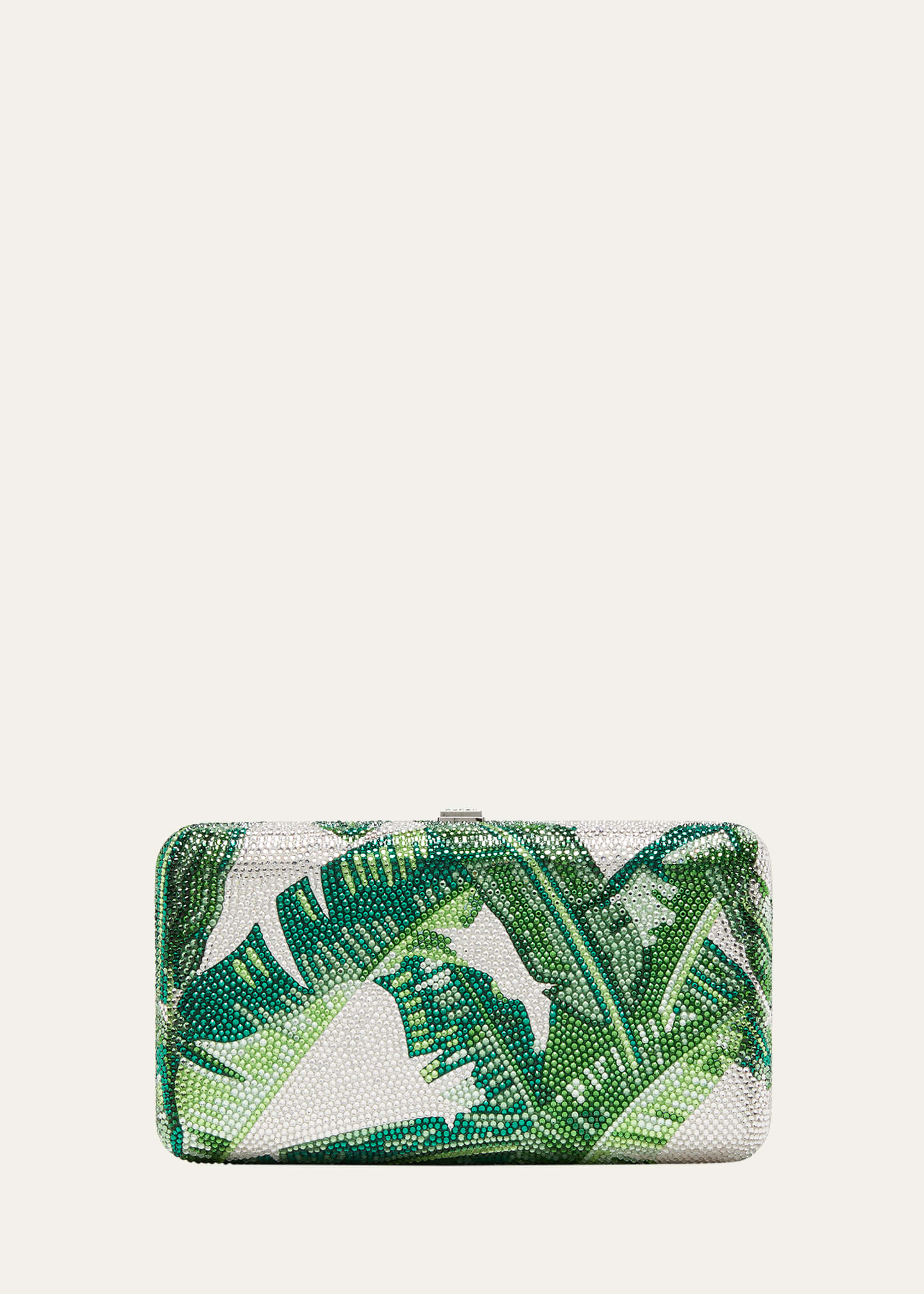 Judith Leiber Couture clutch bag in banana leaves pattern European crystals and brass Detachable shoulder strap, 12" drop/ 25"L Can be worn as a clutch or shoulder bag Framed top with push-lock closure Approx. 4"H x 7.5"W x 1.5"D Item Weight (Lbs.): 2.0 Made in Italy