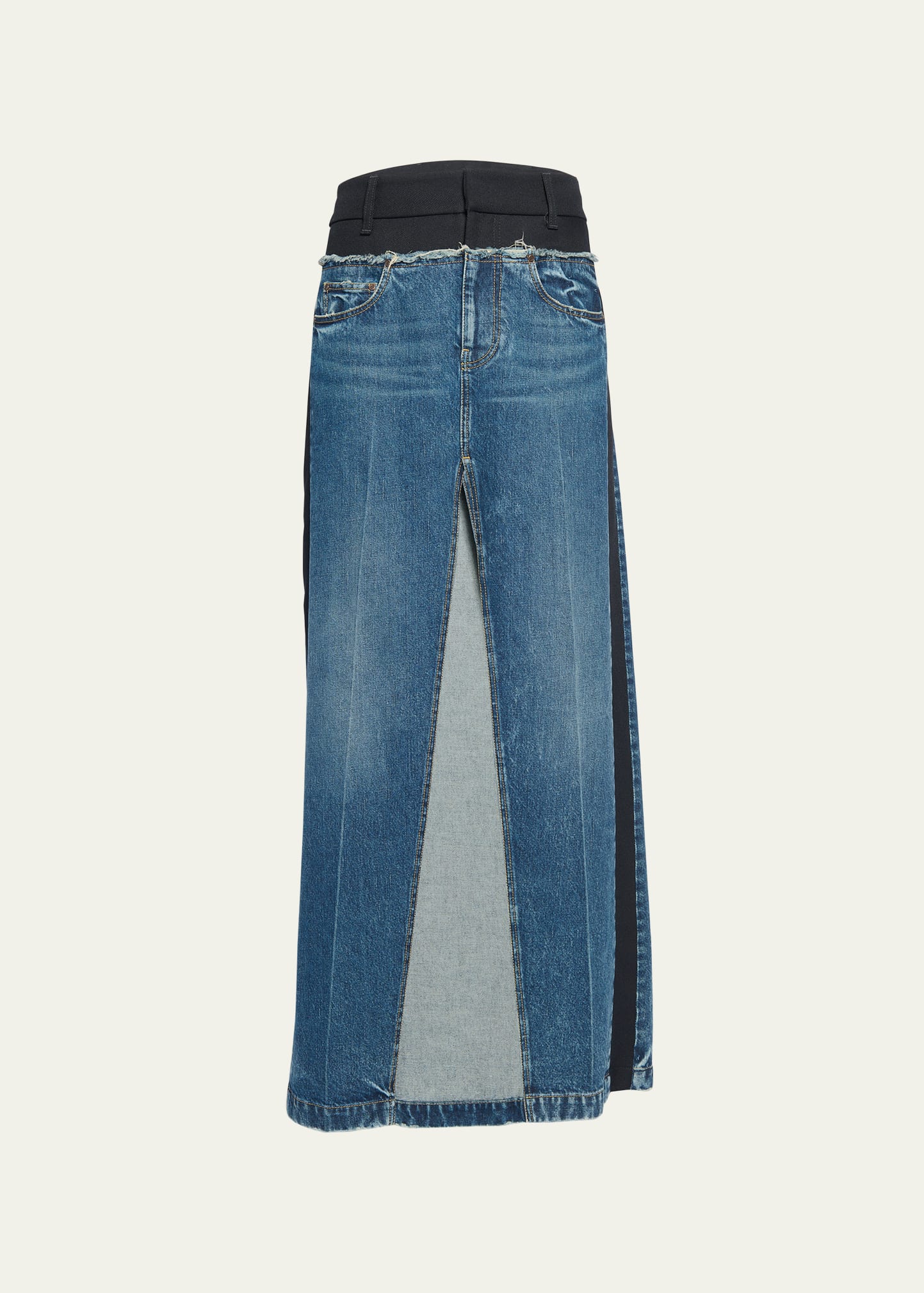 Stella McCartney mixed media twill and denim maxi skirt High rise Button/zip fly; belt loops Five-pocket style Front center slit Full length Hem falls below the knee Skirt falls straight from hip to hem Cotton/polyester/cotton Made in Italy