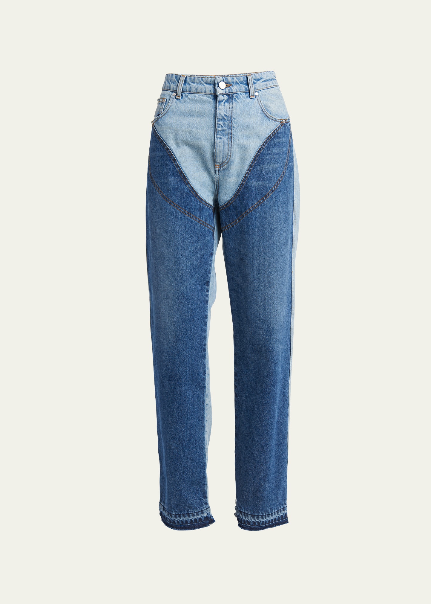 Stella McCartney two-tone denim pants with chap detail Mid rise Five-pocket style Straight legs Full length Distressed hem Button/zip fly; belt loops Cotton Made in Italy