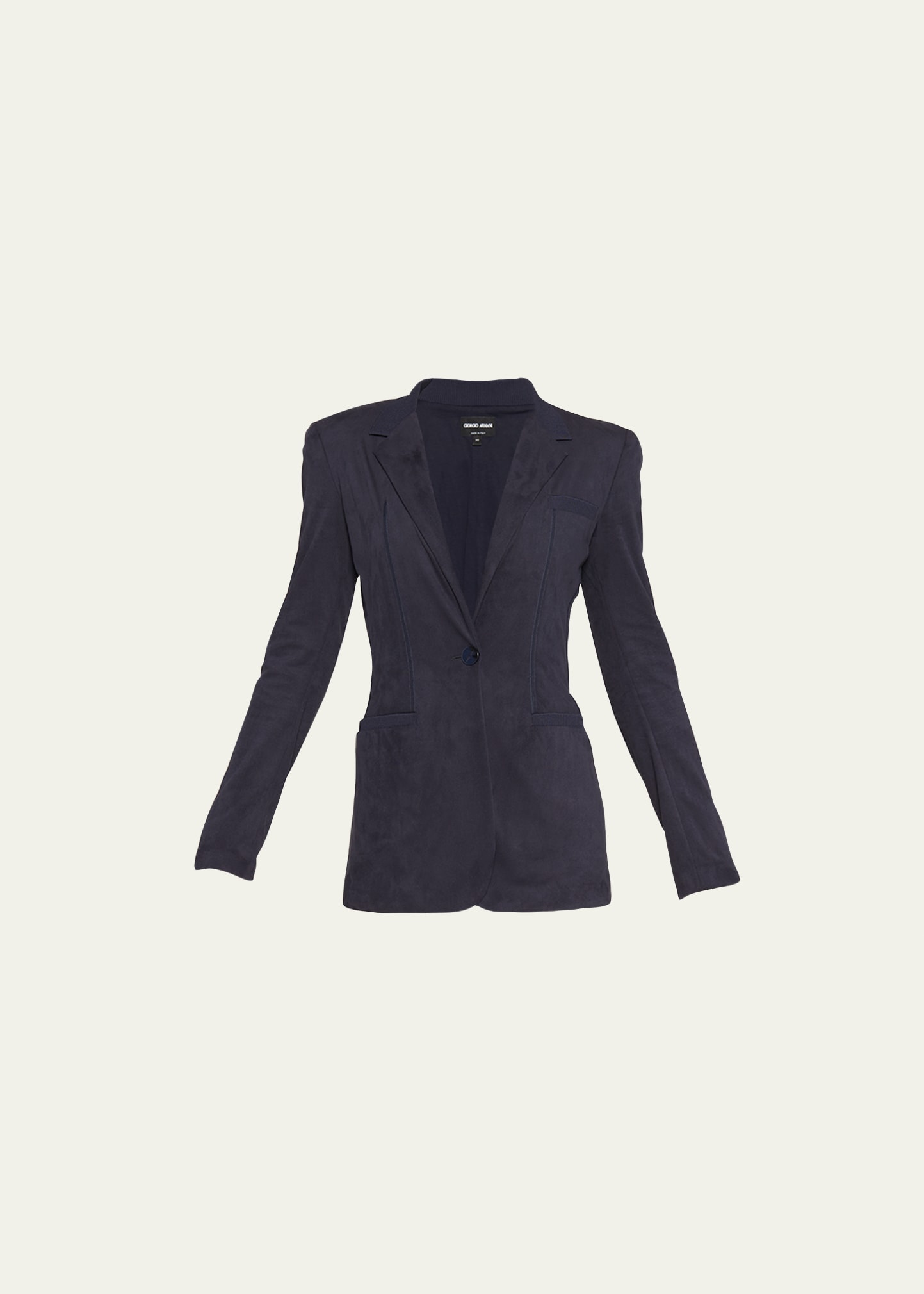 Giorgio Armani ultra vegan suede blazer jacket featuring ribbed collar trim Notched lapels; single-breasted front Long sleeves; concealed cuff closure Front welt pockets Slim tailored fit Polyester/elastane/viscose Dry clean Made in Italy