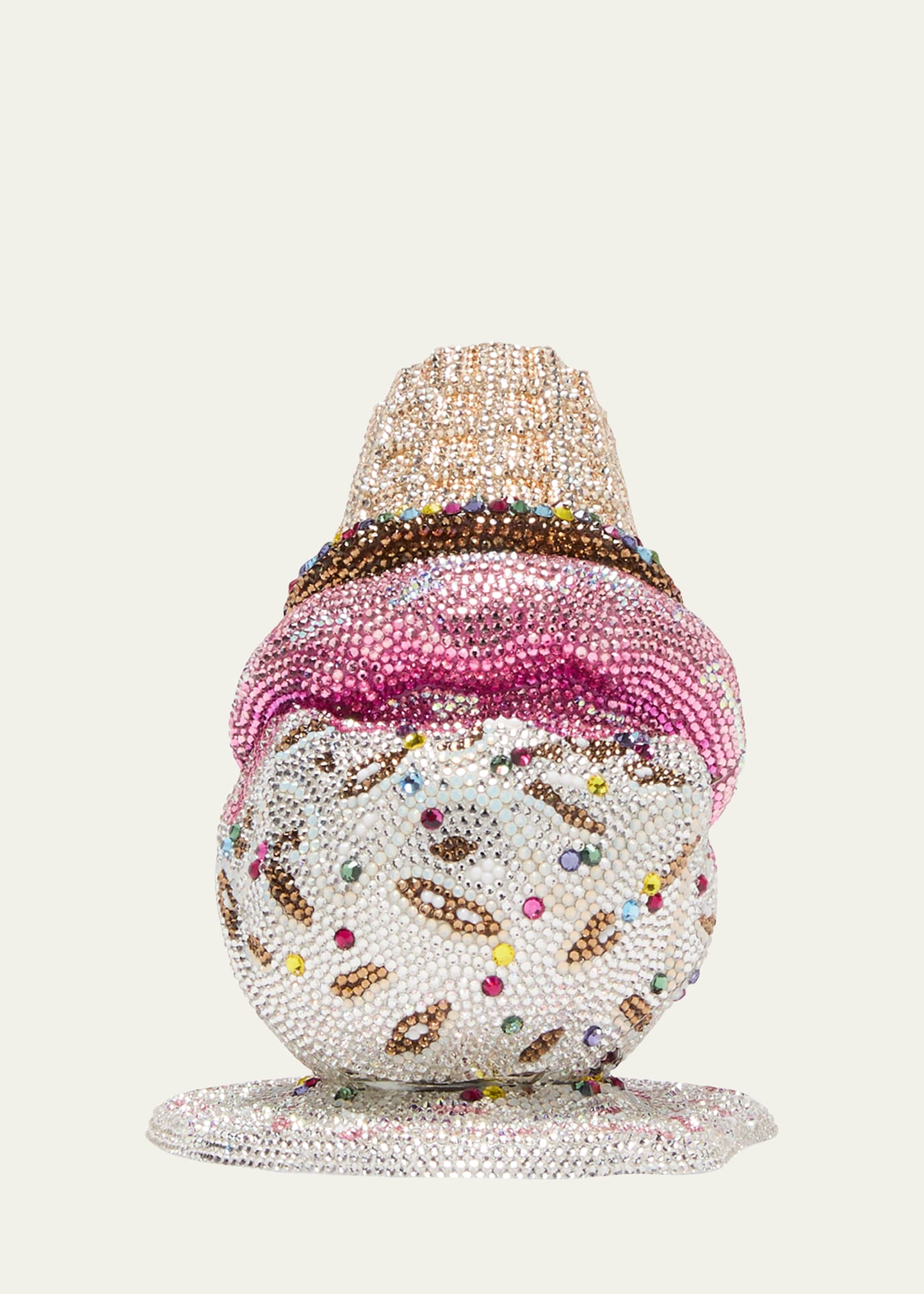 Judith Leiber Couture "Upside Down Cone Oops" minaudiere in allover European crystals, brass, and leather Detachable chain shoulder strap, 9" drop/20"L Cab be worn as a minaudiere or shoulder bag Framed top with push-lock closure Approx. 5.3"H x 5.5"W x 4.8"D Item Weight (Lbs.): 2.0 Made in Italy