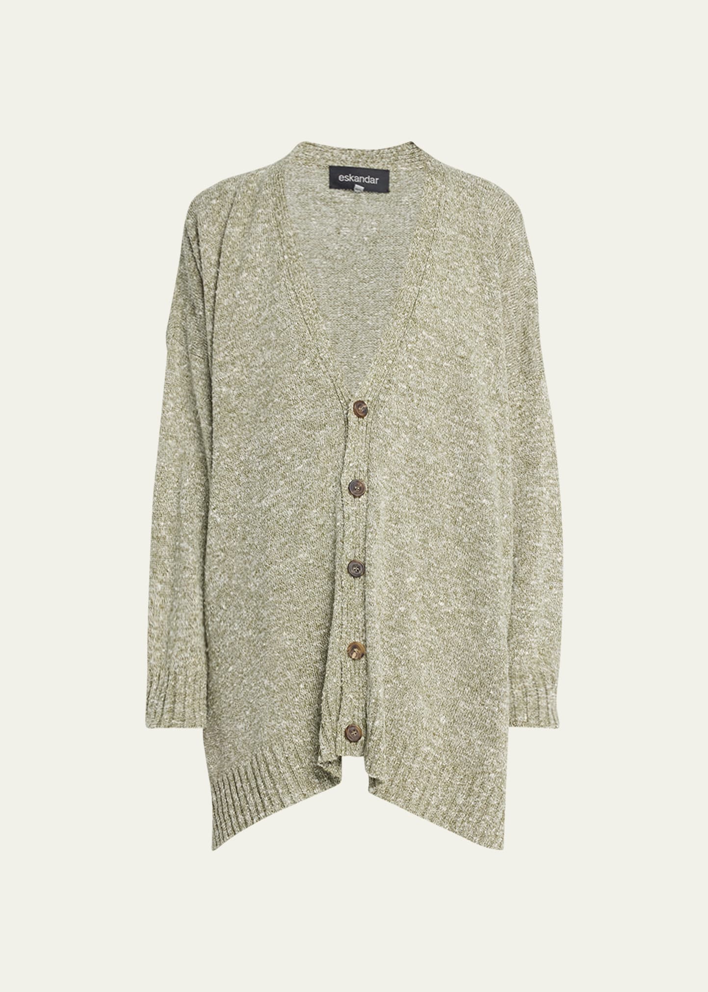 Eskandar cardigan with ribbed trim V neckline; button sewn Long sleeves Mid plus length Side slits Linen/silk Made in United Kingdom