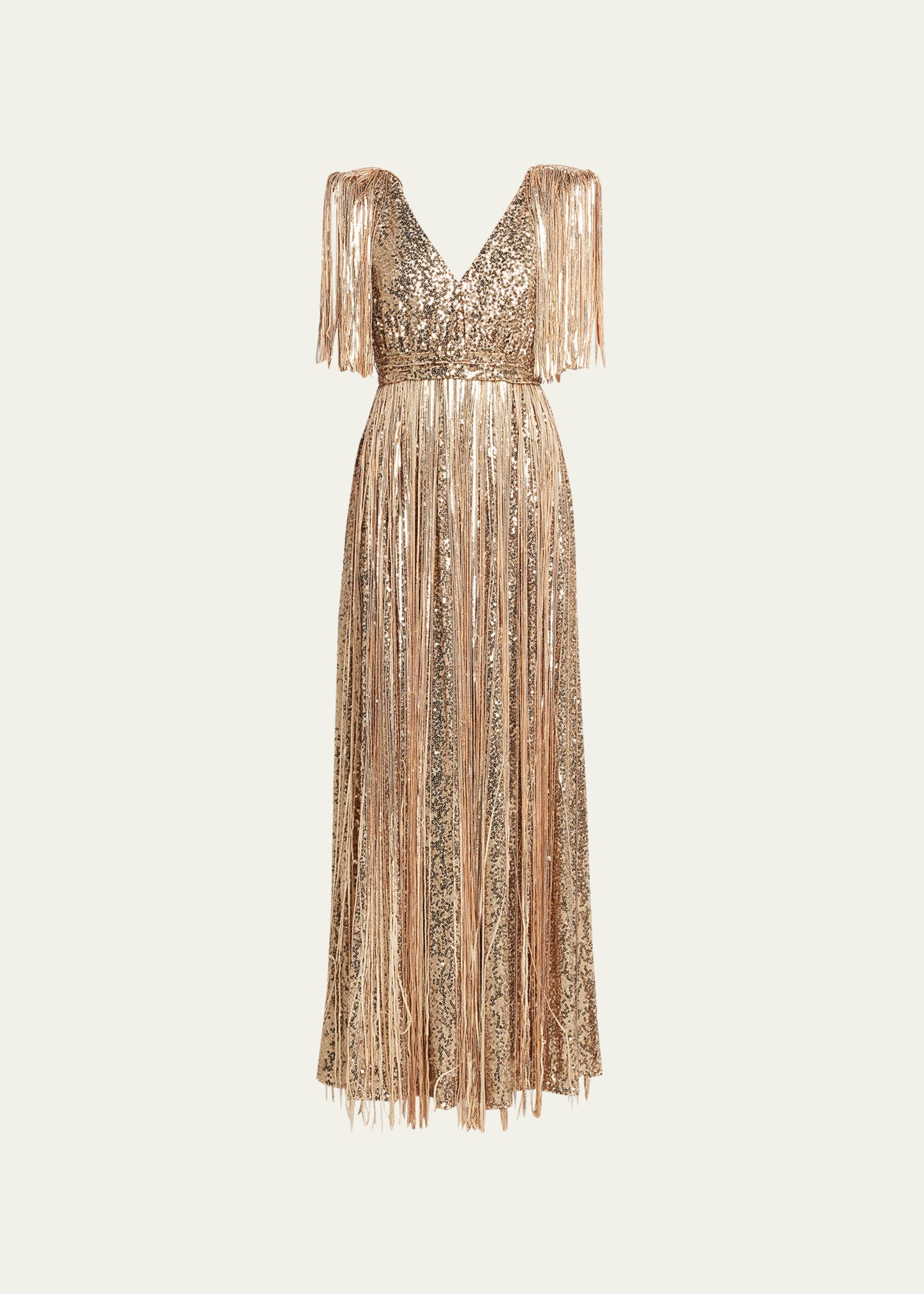 Badgley Mischka Collection sequin gown with fringe V neckline Short sleeves Empire waist Floor-length A-line silhouette Invisible back zipper Polyester/sequins Lining: Polyester Spot clean Imported