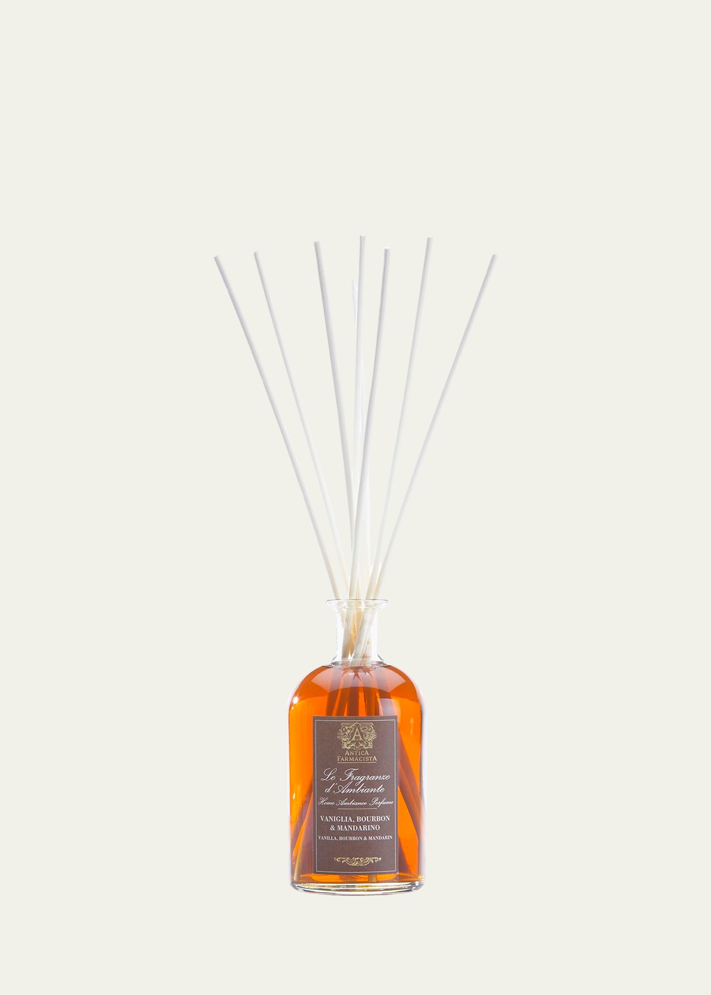 Antica Farmacista Vanilla, Bourbon & Mandarin Home Ambiance Fragrance, 8.5 oz. The Home Ambiance Fragrances utilize antique inspired apothecary bottles, filled with fragrance, to permeate the air through the bottles' open neck and white birch reeds that are inserted to further diffuse the scent. A delightful twist on a vanilla-based fragrance. The sweet richness of warm vanilla is paired with mandarin of Sicily, a crisp full-bodied citrus fragrance. Rounding out this warm blend is the spicy e.