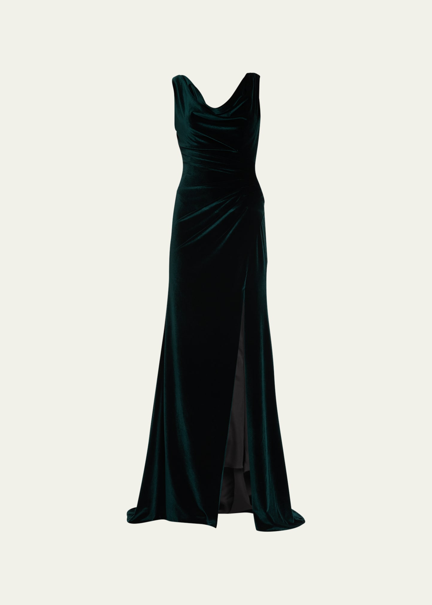 Pamella Roland stretch velvet gown Cowl neckline Sleeveless Gathered waist A-line silhouette Floor length Thigh high slit Polyester self/lining Dry clean Made in USA