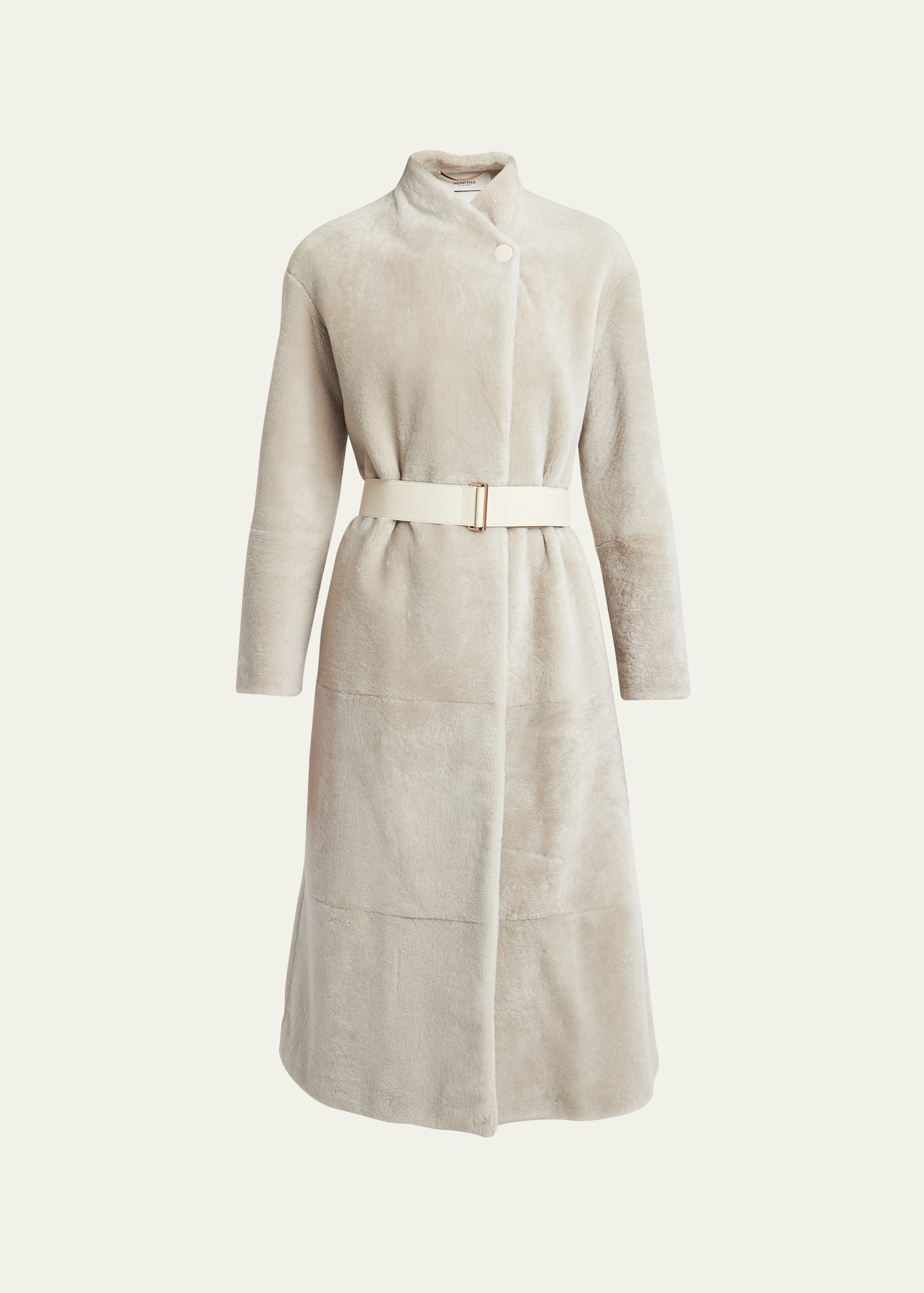 Agnona belted top coat in a velvet shearling finish (Italy) Band collar; button closure Open front Long sleeves Adjustable belted waist Knee length Relaxed fit Wool/sheep shearling Made in Italy