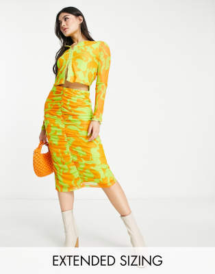 Vero Moda X Joann Van Den Herik mesh ruched midi skirt in orange and lime print - part of a set