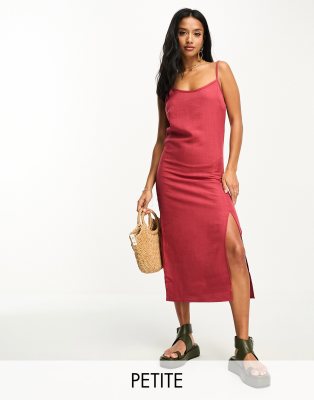 Vila Petite linen touch cami midi dress with slit front in terracotta-Auburn