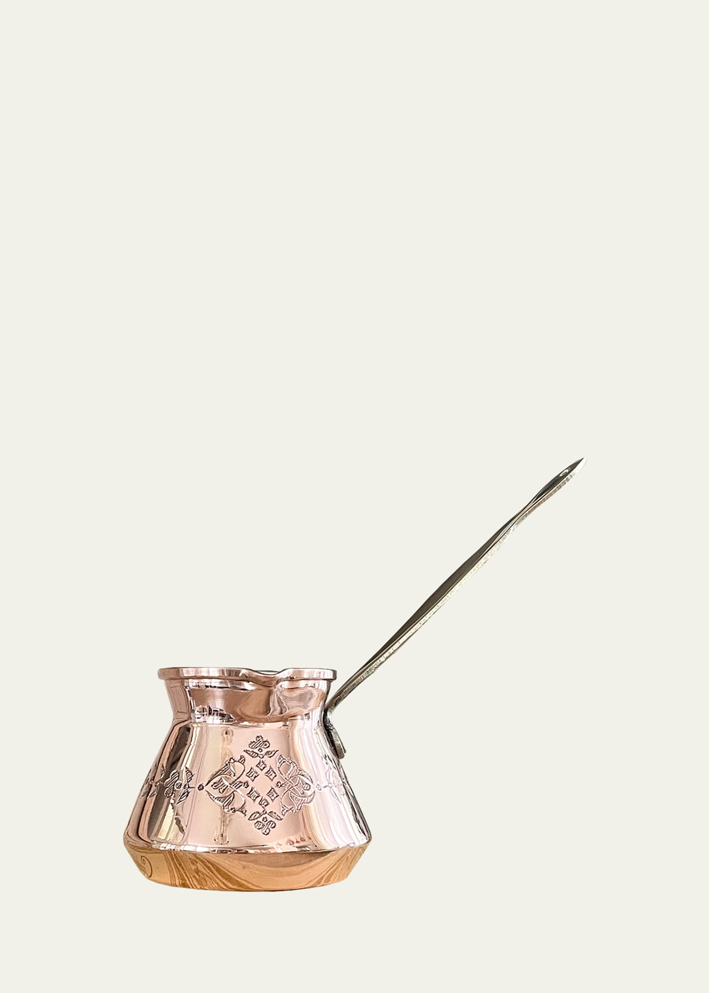Traveling to turkey inspired me to design and produce a traditional Turkish coffee pot. I fell in love with not only their coffee but also their traditions such as this kind of pot. The pattern was designed by owner beth ann and the end result is the sweetest pot to make Turkish coffee in! Features a shaped pouring spout, thick brass handle, and etched pattern all the way around. Approx. 7.3"L x 3.5"W x 4"T Item Weight (Lbs.): 2.0 Hand wash Imported