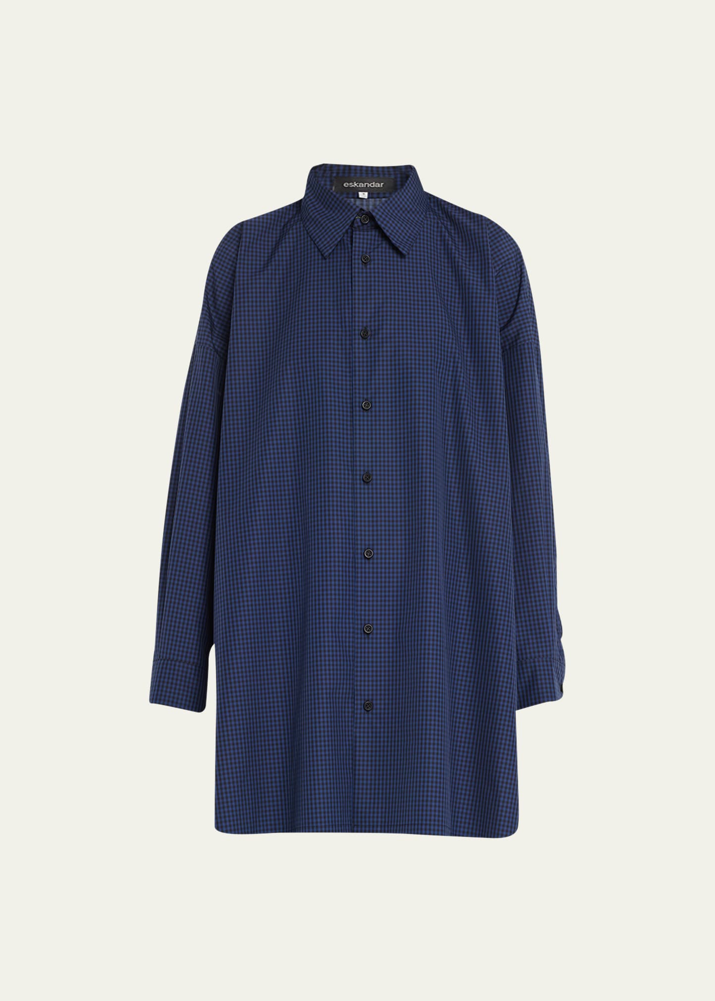 Eskandar wide a-line shirt in allover check (long plus) Spread collar Button-sewn closure Long sleeves Side slits Mid-length Relaxed fit Organic cotton Made in Poland
