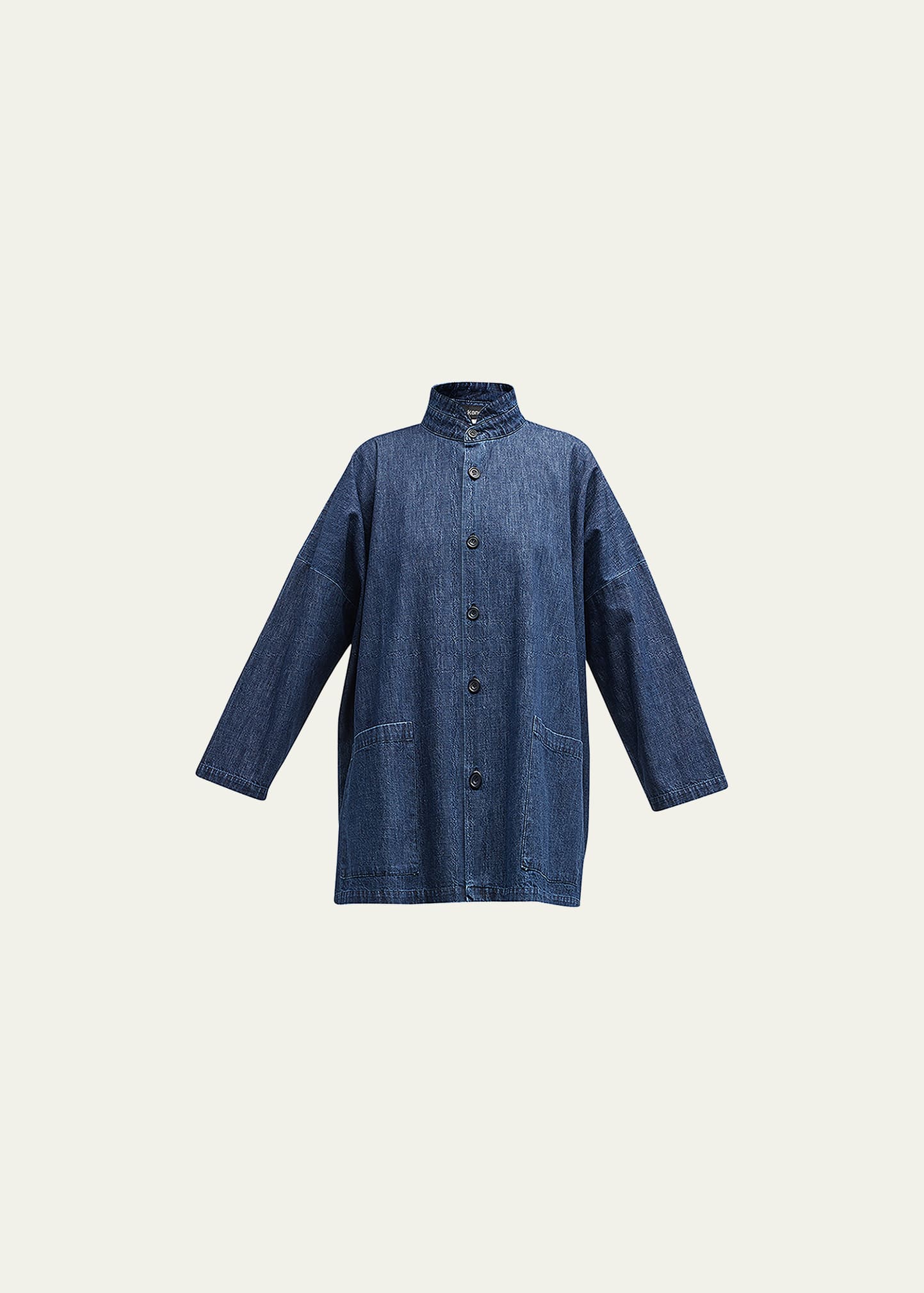 Eskandar denim jacket with a longer back Double stand collar; concealed button front Long sleeves Drop shoulders Side patch pockets Wide fit Long length Cotton Imported