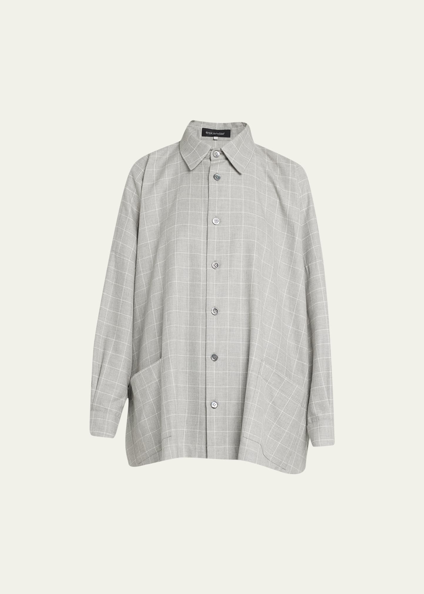 Eskandar wide longer back check-print shirt jacket with collar (long) Single-breasted front Spread collar Button-sewn closure Long sleeves Front patch pockets Mid-length Relaxed fit Cotton Made in Poland