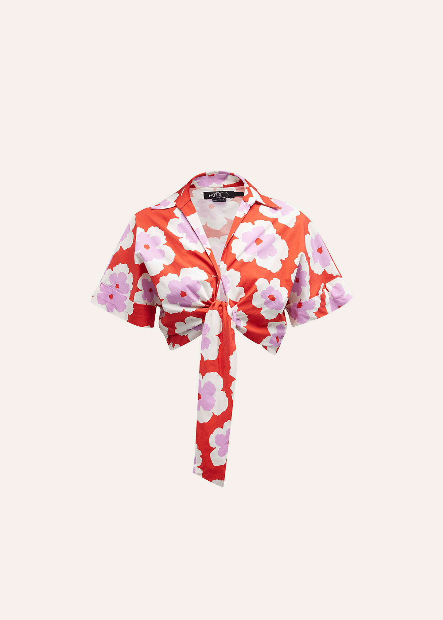 PatBO "Windflower" top in an allover floral print with cuffed sleeves Approx. 18.2"L from shoulder to hem Spread collar; self-tie front Short sleeves Cropped length Cotton/elastane Made in Brazil