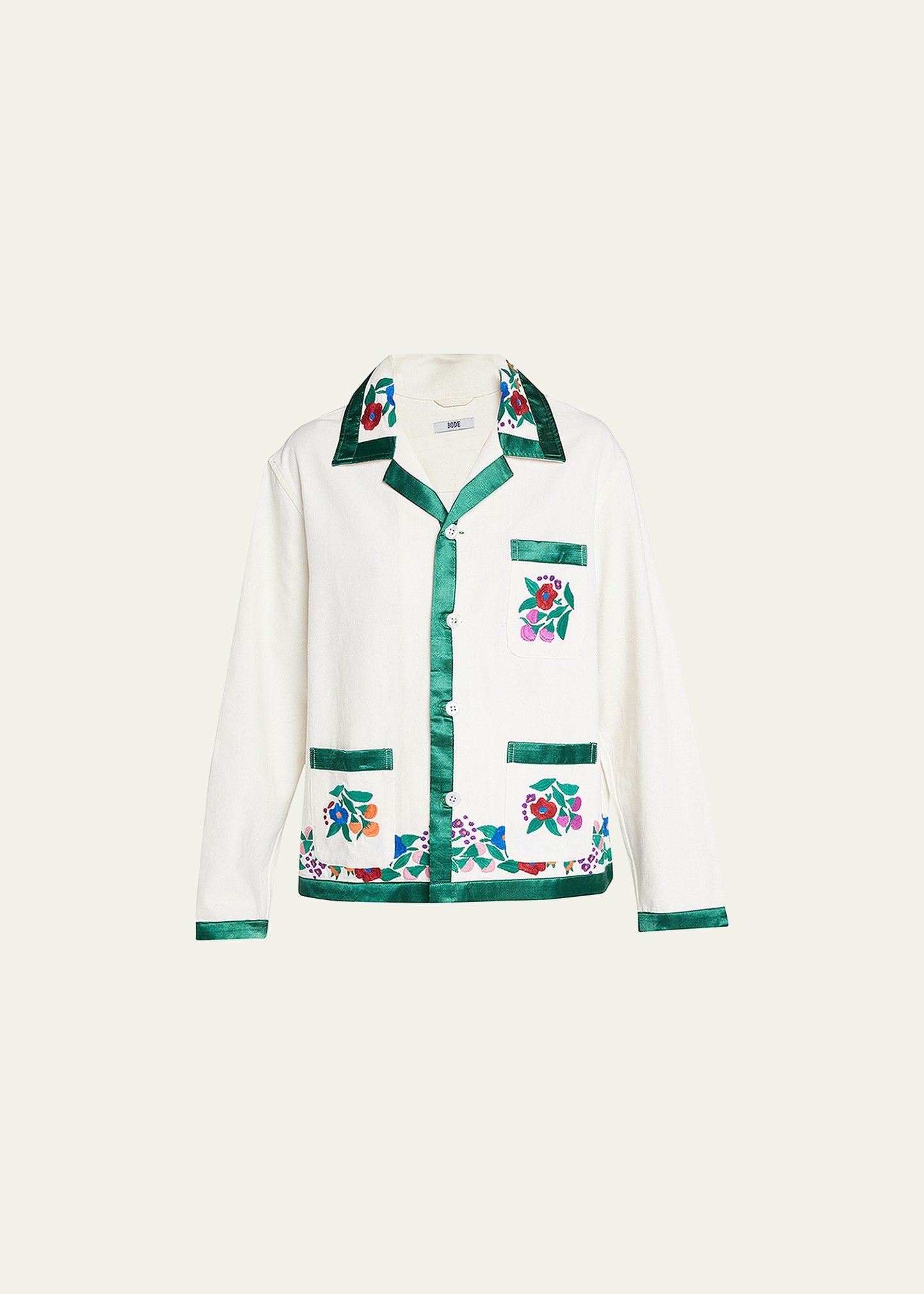 Bode "Winter Garden" overshirt with floral embroidery and contrast trim Notch lapels; button front Long sleeves Chest patch pocket; hip patch pockets Boxy fit Cotton Imported