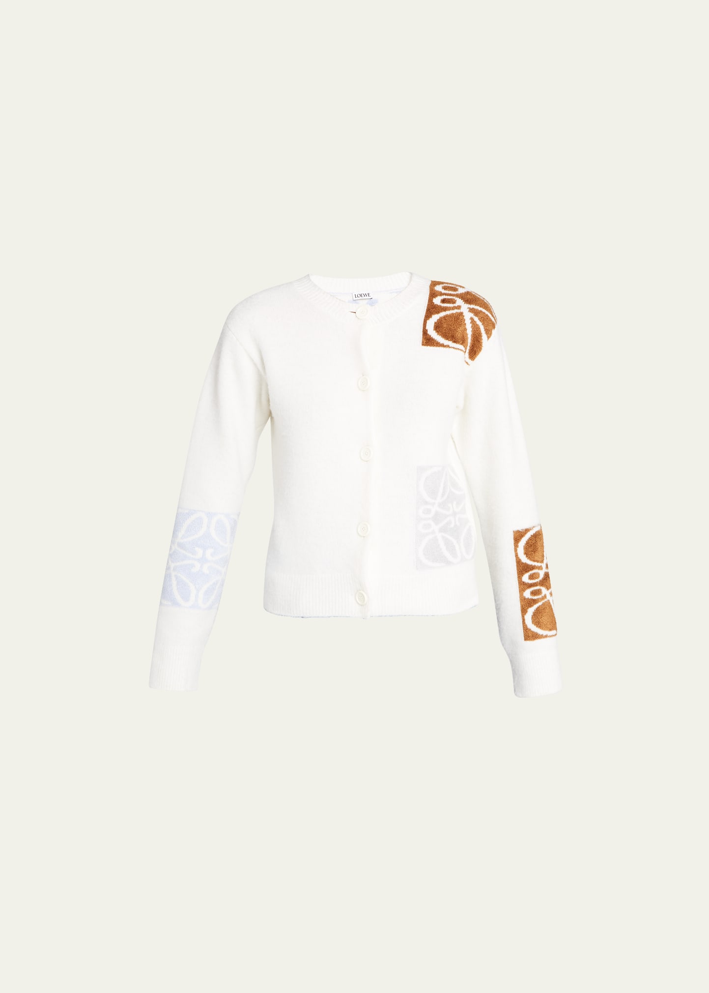 Loewe wool cardigan features anagram intarsia knit details throughout Crew neckline Button front Long sleeves Ribbed trim Hip length Relaxed fit Pullover style Wool/viscose/nylon Made in Italy