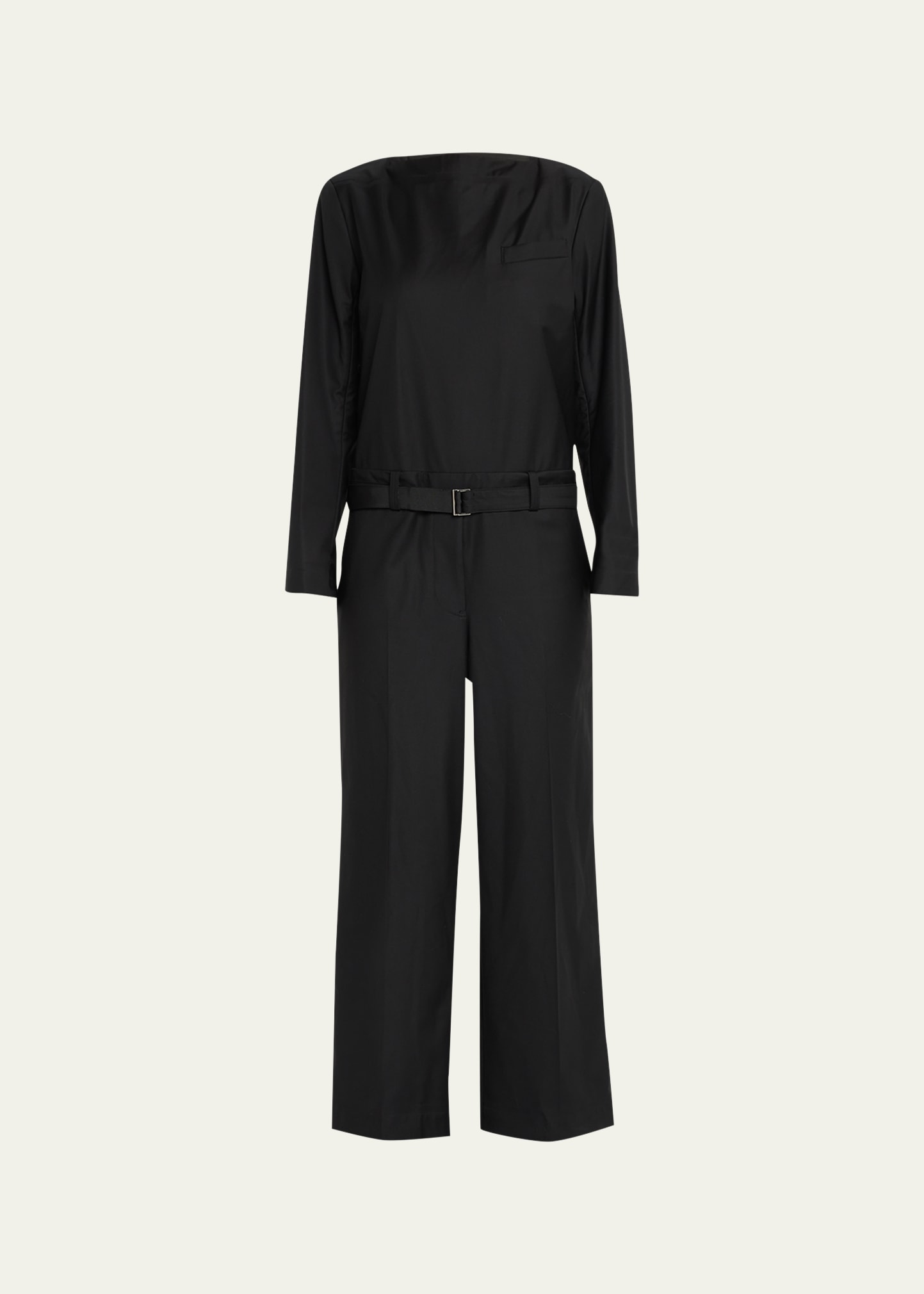 SACAI belted suiting jumpsuit in a wool blend features contrast stripe details at back Boat neckline Long sleeves; button cuffs Open back; self-tie closure Front ticket pocket; back welt pockets Adjustable belted waist; belt loops Straight legs Full length Relaxed fit Wool/polyester/cupro Made in Japan