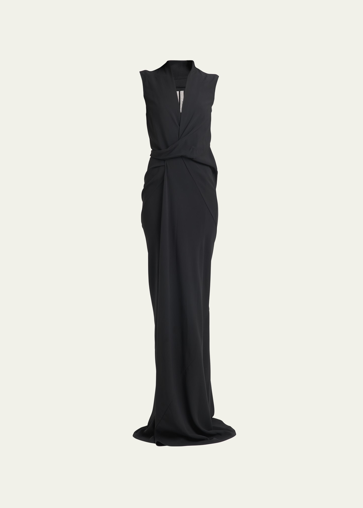 Rick Owens wrap-around gown Approx. 64"L from shoulder to hem V neckline Sleeveless; approx. 4.2"L Column silhouette Hem pools floor Viscose/acetate Unlined Dry clean Made in Italy