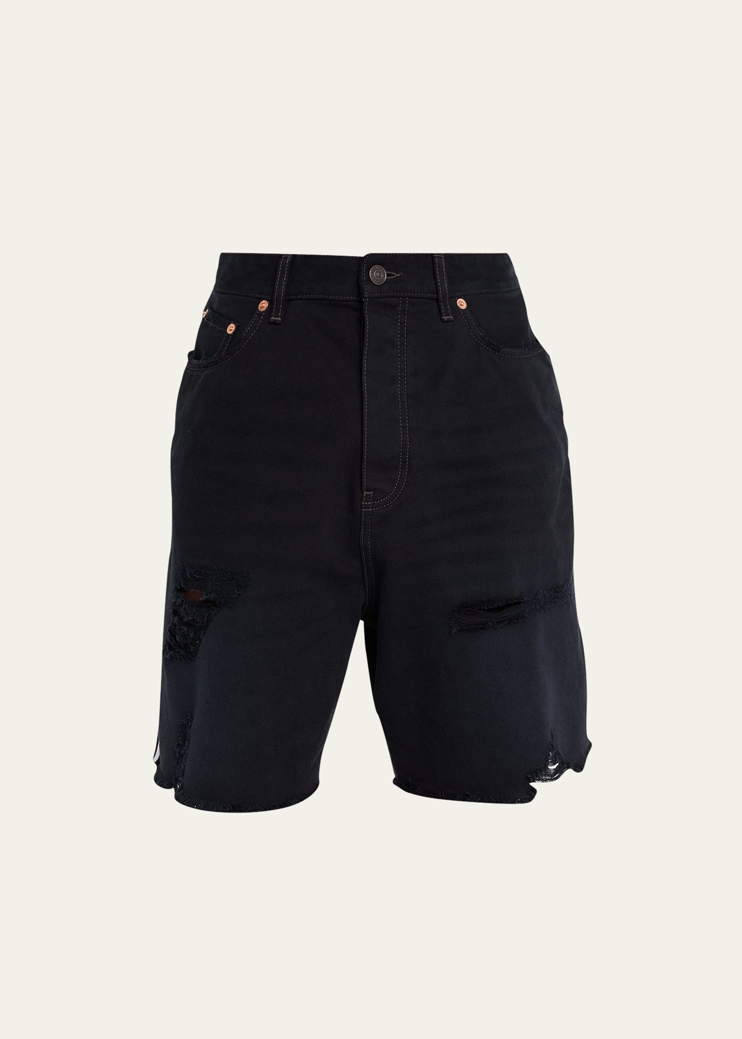 Balenciaga x Adidas shorts in destroyed denim Regular rise Five-pocket style Contrasting 3-Stripes mark at sides Baggy fit Button closure/zip fly; belt loops Cotton Lining: Cotton/polyester Made in Italy